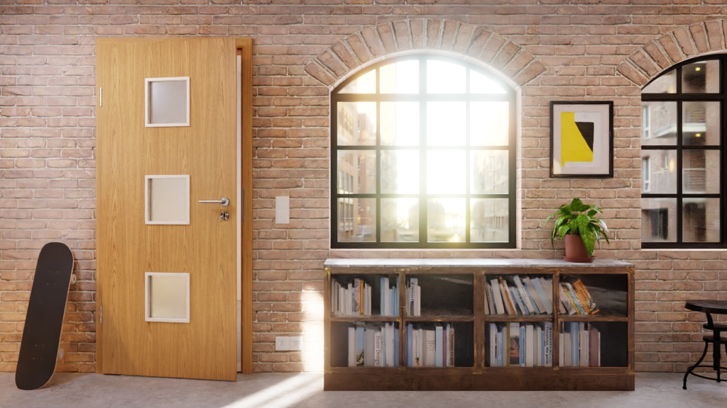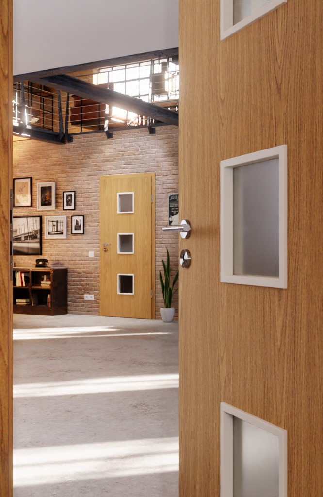 Kwadratowe otwory świetlne w środku drzwi wewnętrznych umożliwiają różnorodne oświetlenie. Dzięki nakładającemu się układowi uzyskuje się również widok na drugą stronę drzwi, a dolna część jest chroniona przed uszkodzeniami szkła.