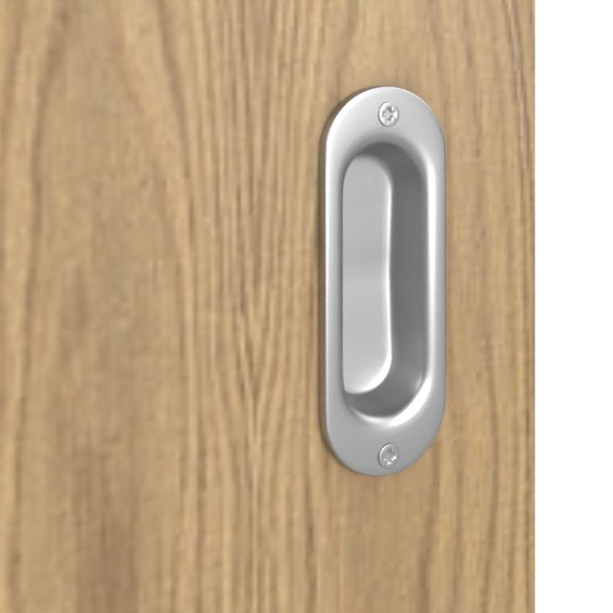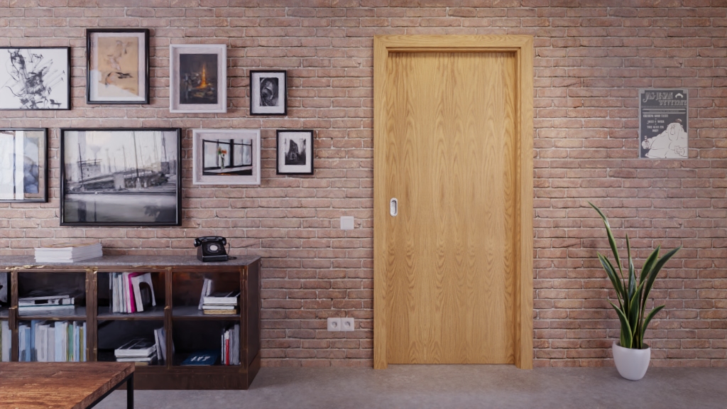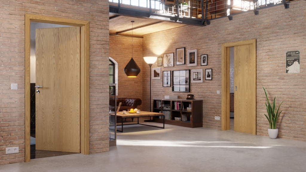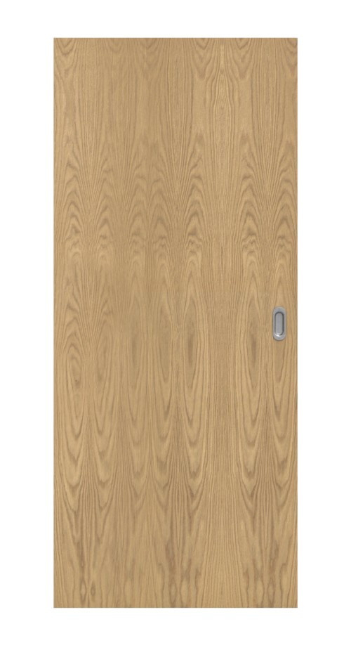 Drzwi przesuwne płynnie przesuwają się w lub przed ścianą, oszczędzając miejsce. Gładka powierzchnia drzwi w jasnym dębie staje się nowoczesnym akcesorium do wnętrza.