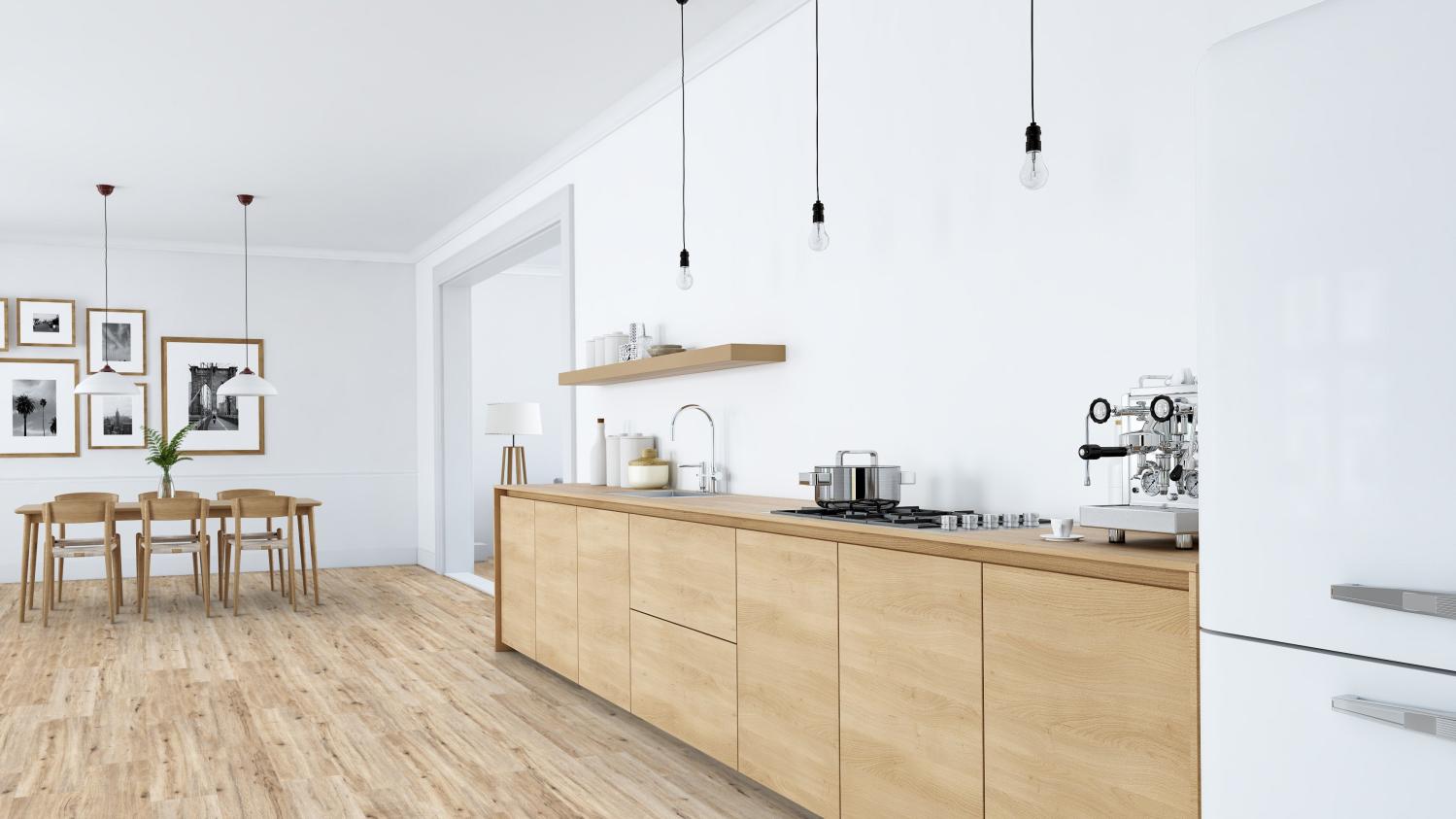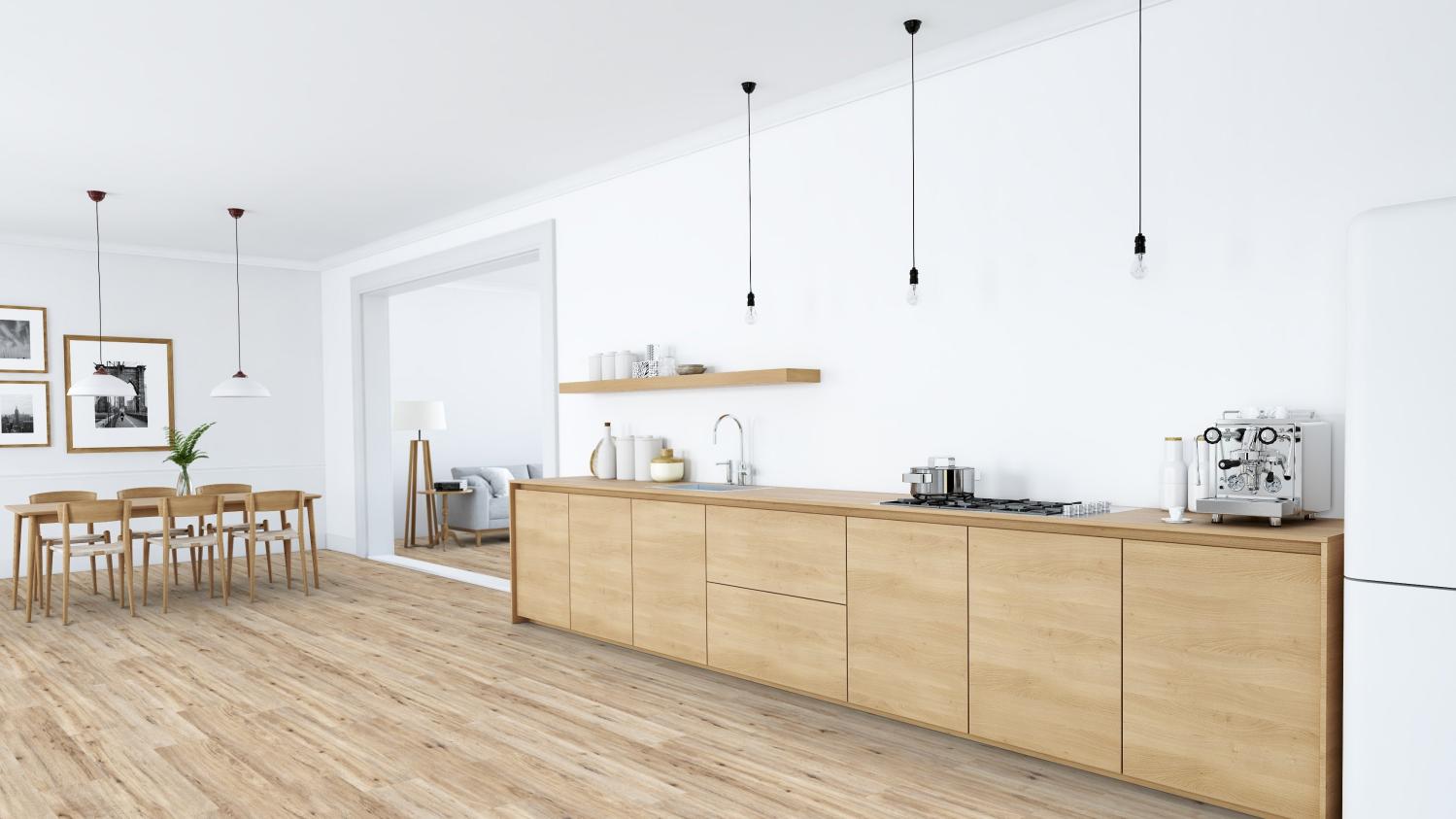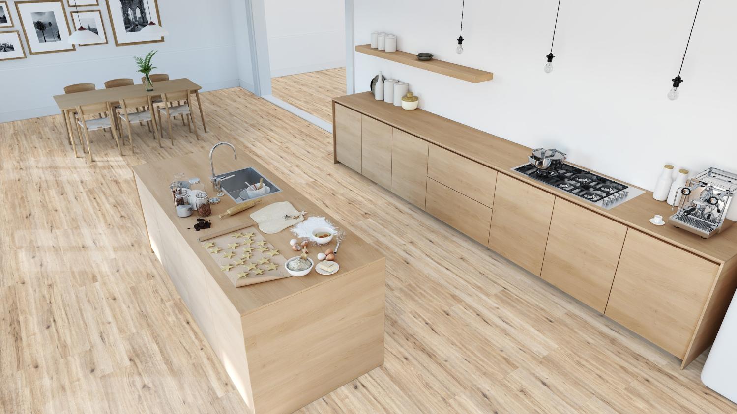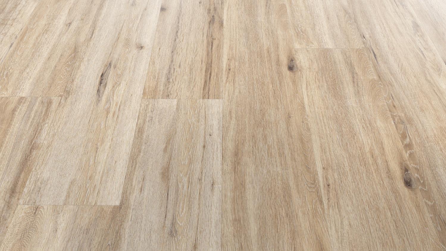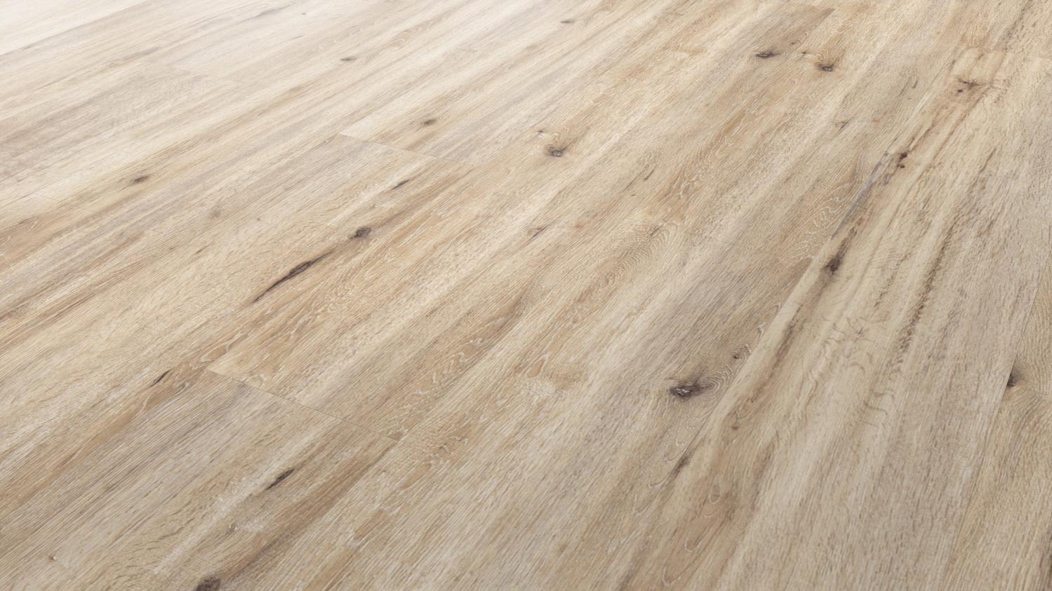 Jak kawałek natury: podłoga dekoracyjna zachwyca autentycznym dekorem drewna. Sęki i usłojenie tworzą niezwykły kontrast z jasnym kolorem desek jednorzędowych. Design wydaje się szczególnie żywy dzięki ułożeniu z fugą, która podkreśla każdą pojedynczą deskę.
