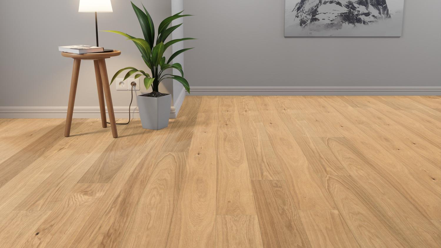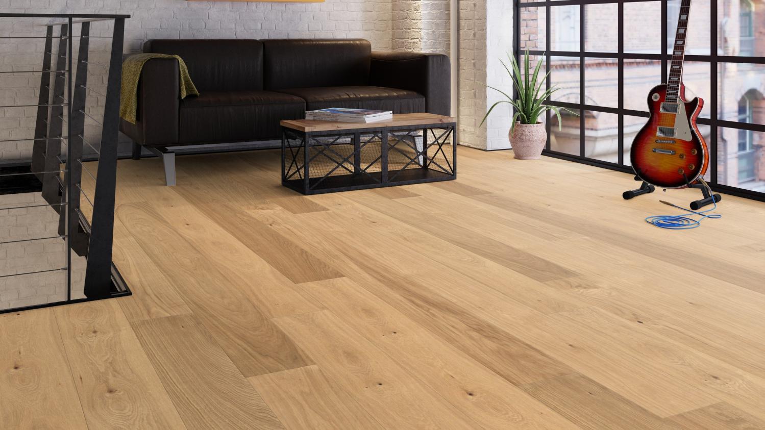 Jasne deski w stylu rustykalnym z fugą w kształcie litery V nadają pomieszczeniu wyjątkowo skandynawski, relaksujący charakter. Ten charakterystyczny dąb wyróżnia się naturalnym wyglądem drewna, który podkreślają wyraźne sęki i pęknięcia .
