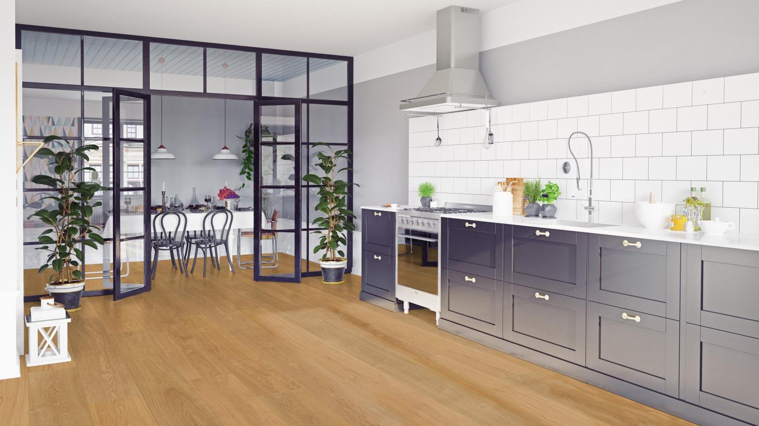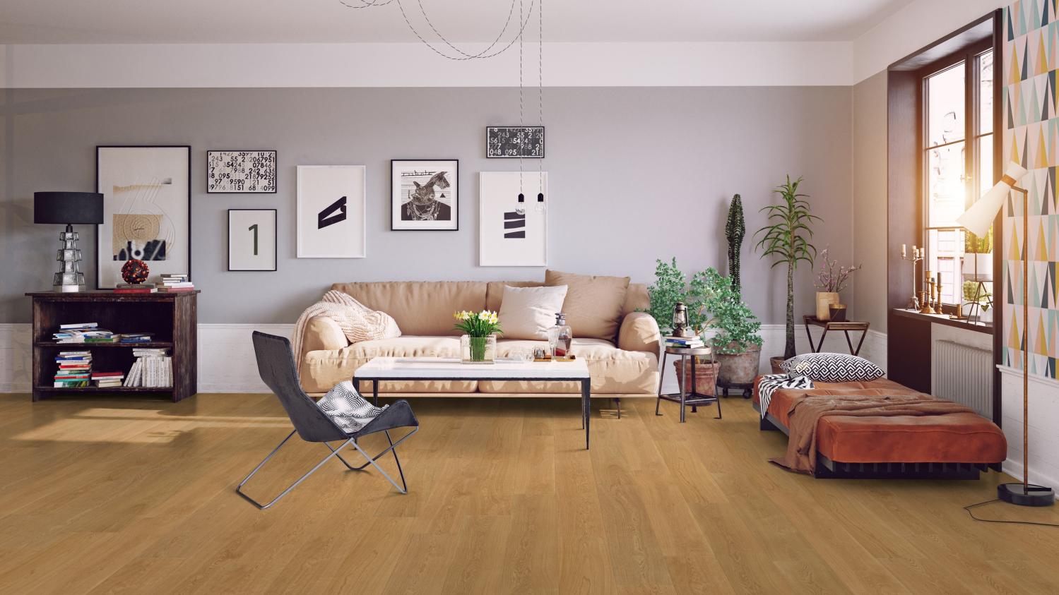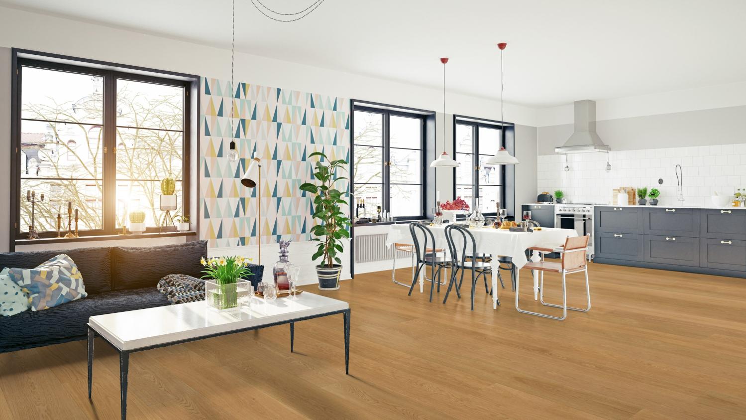 Podłoga z prawdziwego drewna, prawdziwa rzadkość: Deski podłogowe z naturalnego szczotkowanego dębu z kolekcji Lindura HD 400 firmy MEISTER szczególnie dobrze prezentują się w dużych pomieszczeniach.