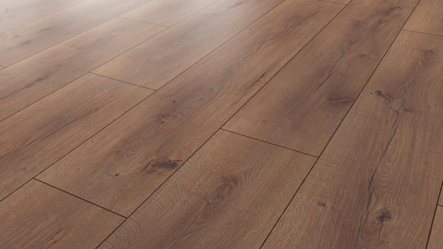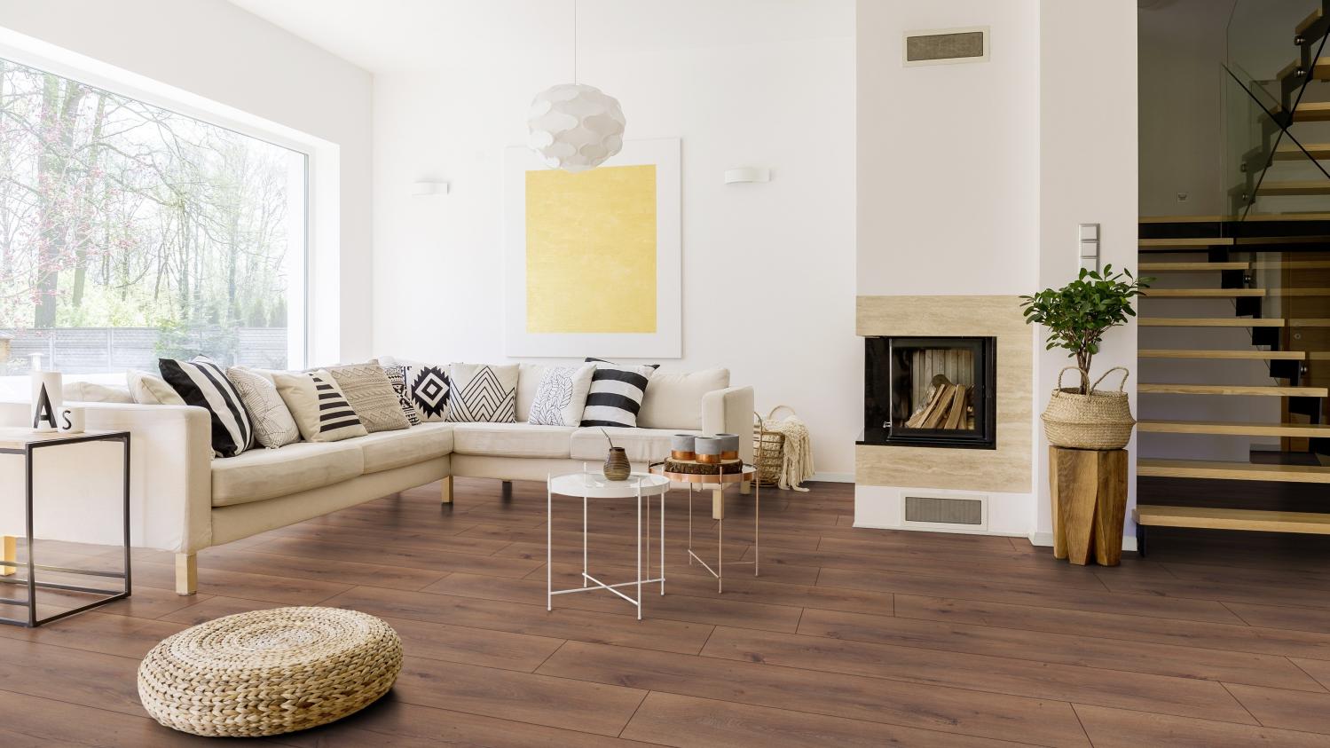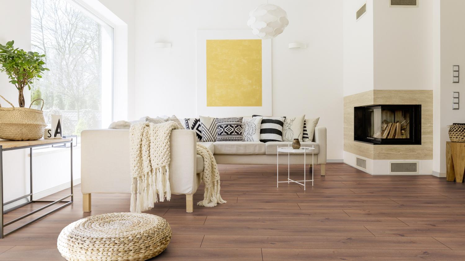 Powierzchnia o wyraźnie autentycznym wyglądzie: Podłoga laminowana w kolorze dębu Orlando z kolekcji Natural Touch firmy Kaindl przekonuje swoim niepowtarzalnym charakterem i sprawia, że Twoje mieszkanie wygląda jeszcze bardziej naturalnie.