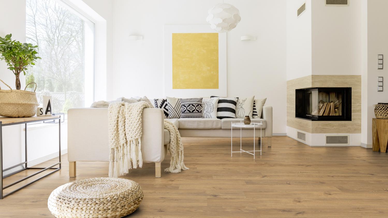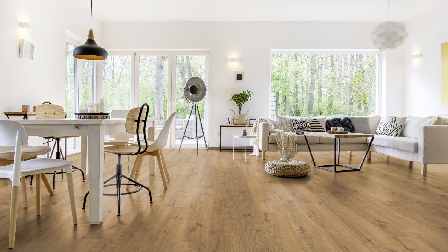 Łatwe w pielęgnacji i trwałe: Dzięki panelom laminowanym dębowym Portland natura authentic z serii TRITTY 200 Aqua Silent Pro firmy Haro zyskasz wytrzymałą podłogę w swoich pomieszczeniach mieszkalnych.
