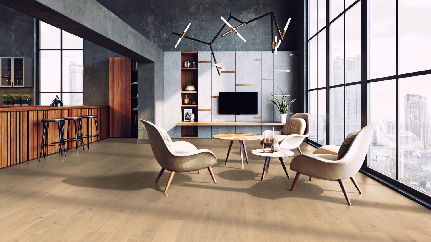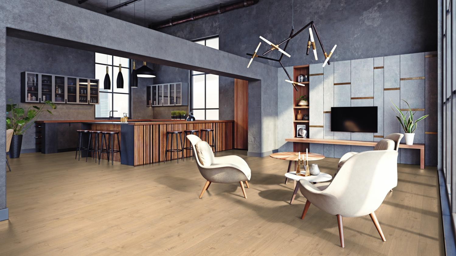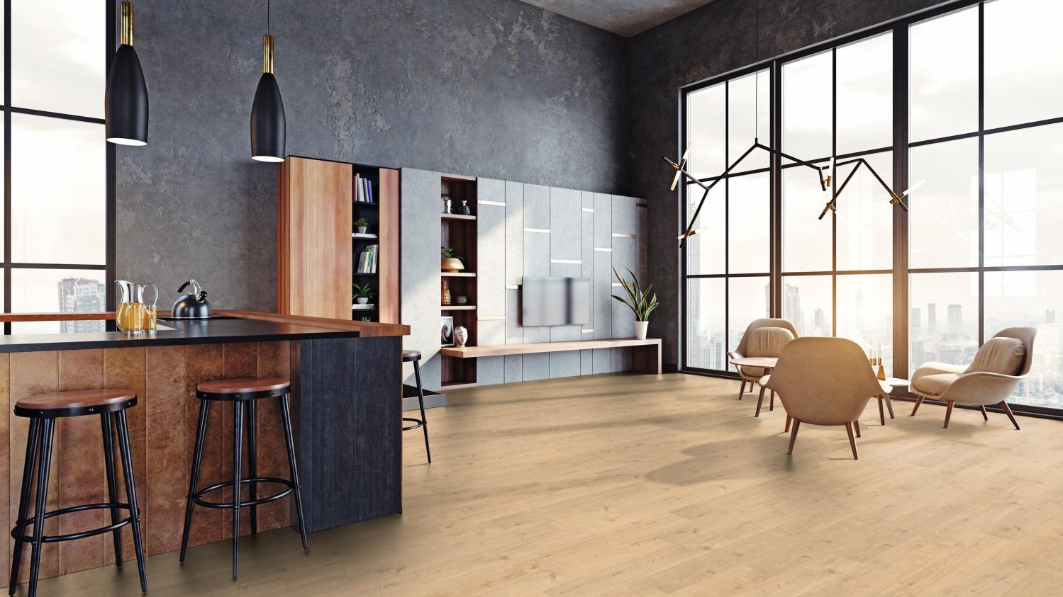 Trwała podłoga do Twojego mieszkania: Panele laminowane dębowe Portland puro authentic z serii TRITTY 100 Silent Pro firmy Haro to podłoga łatwa w pielęgnacji i trwała.