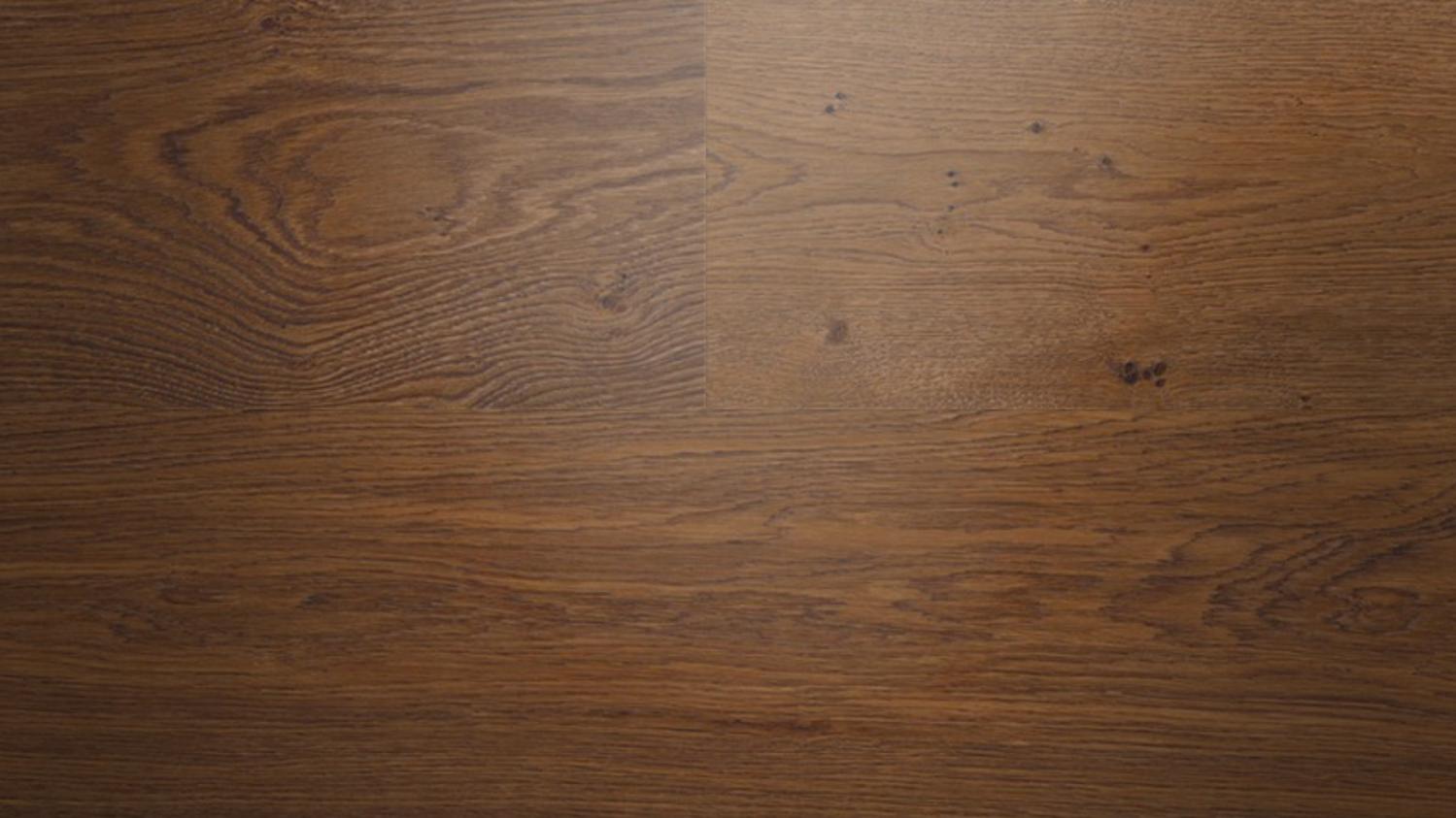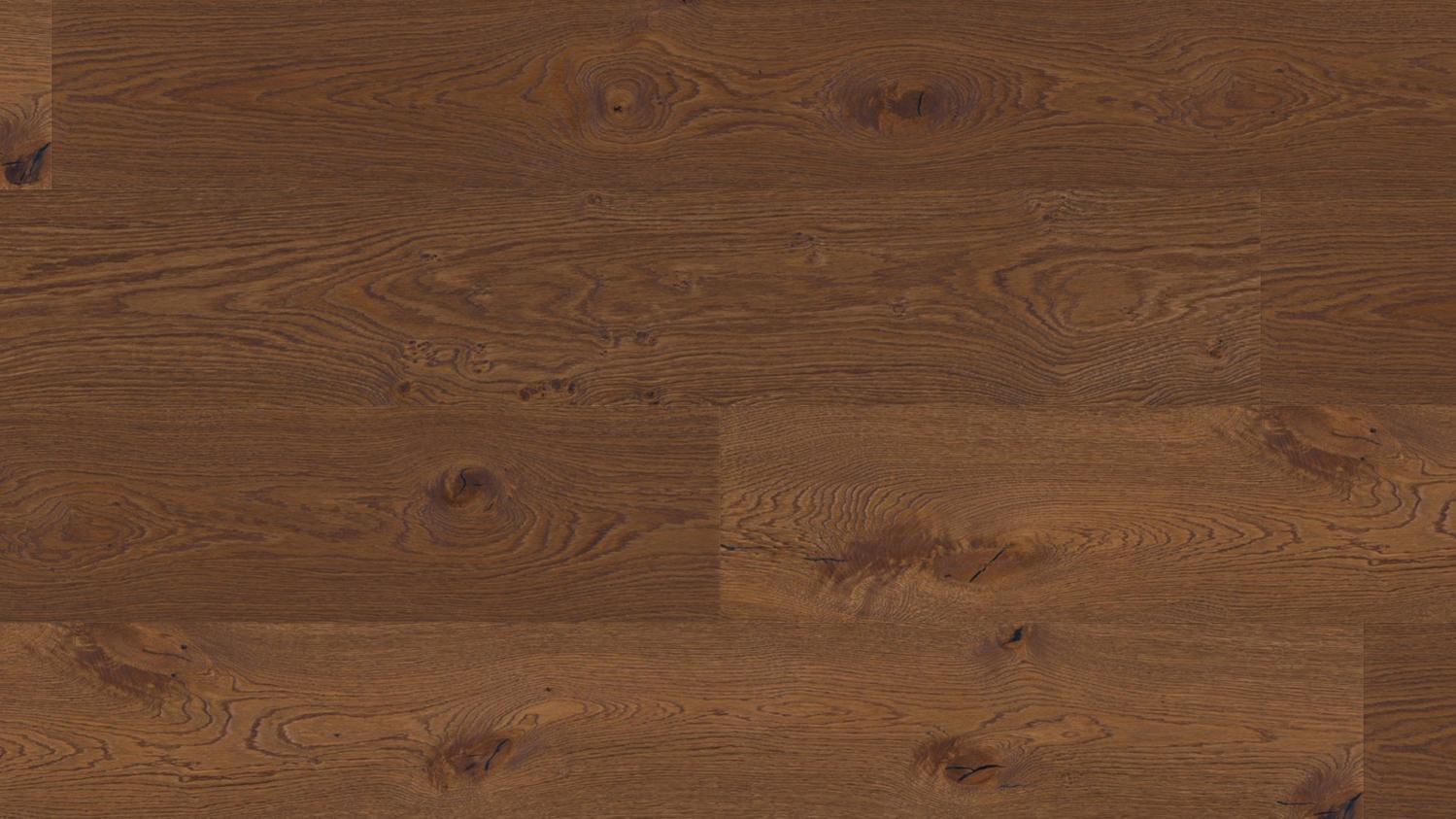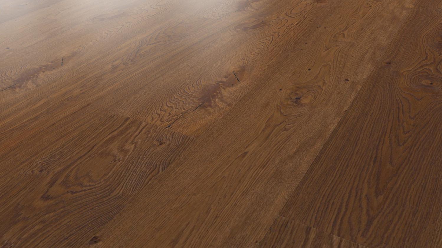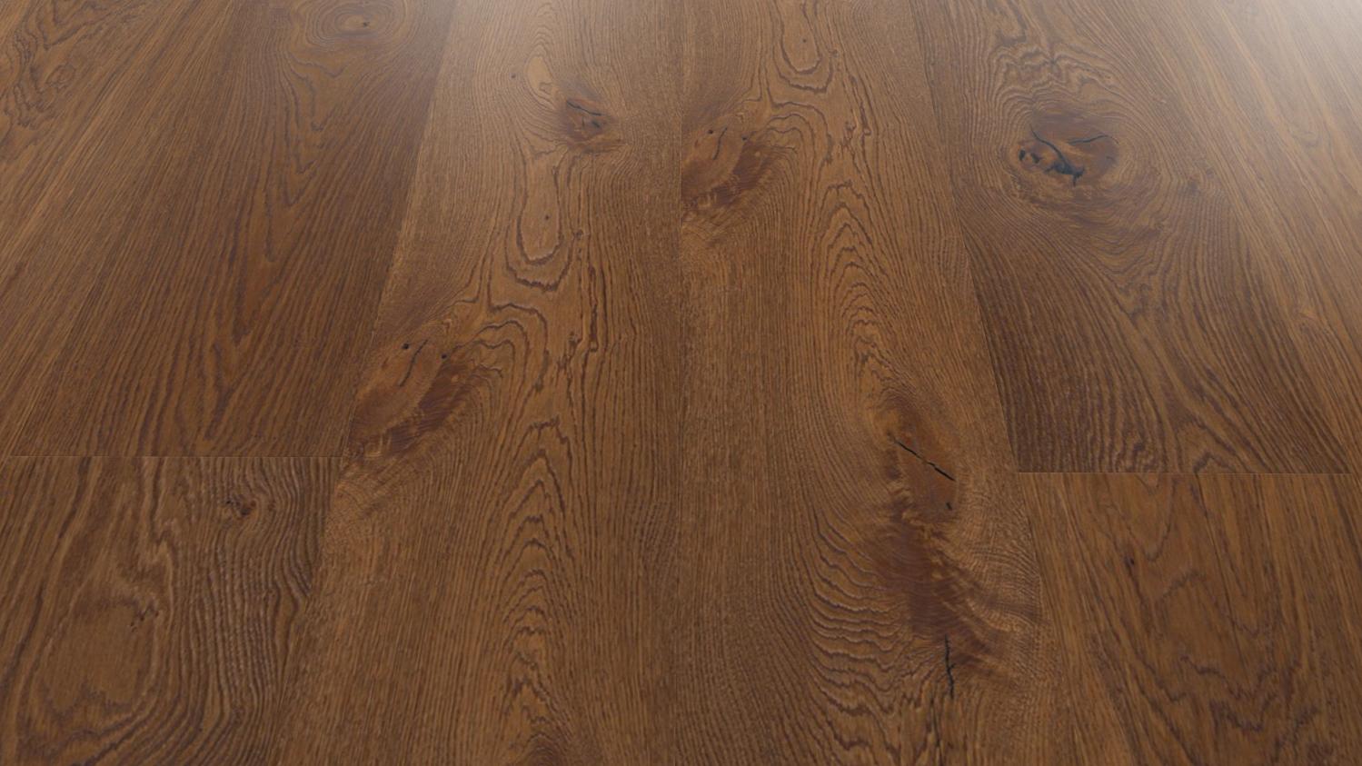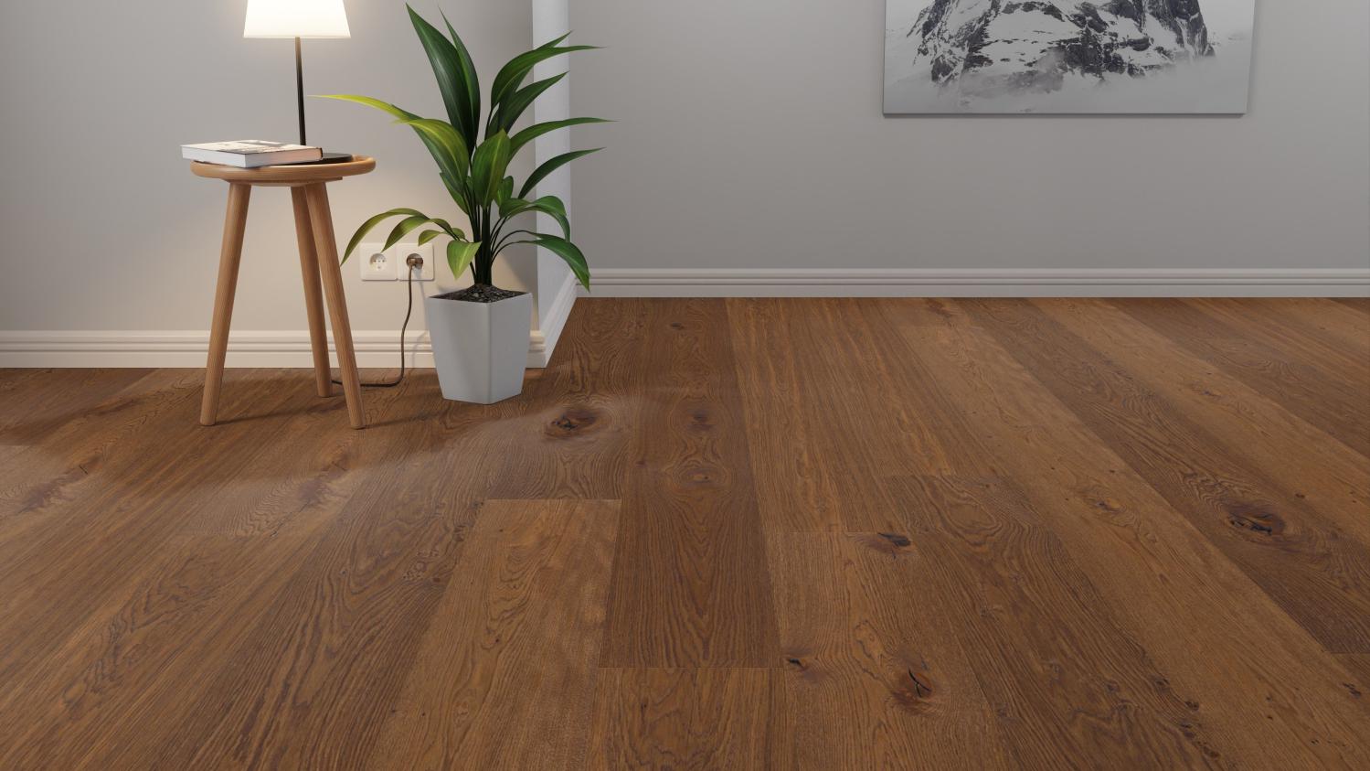 Ta podłoga, o rustykalnym wyglądzie i sękatym usłojeniu, zachwyca autentycznym wyglądem drewna. Parkiet zachwyca ponadto wyjątkowo szerokimi deskami z mikrofazą biegnącą na całym obwodzie.