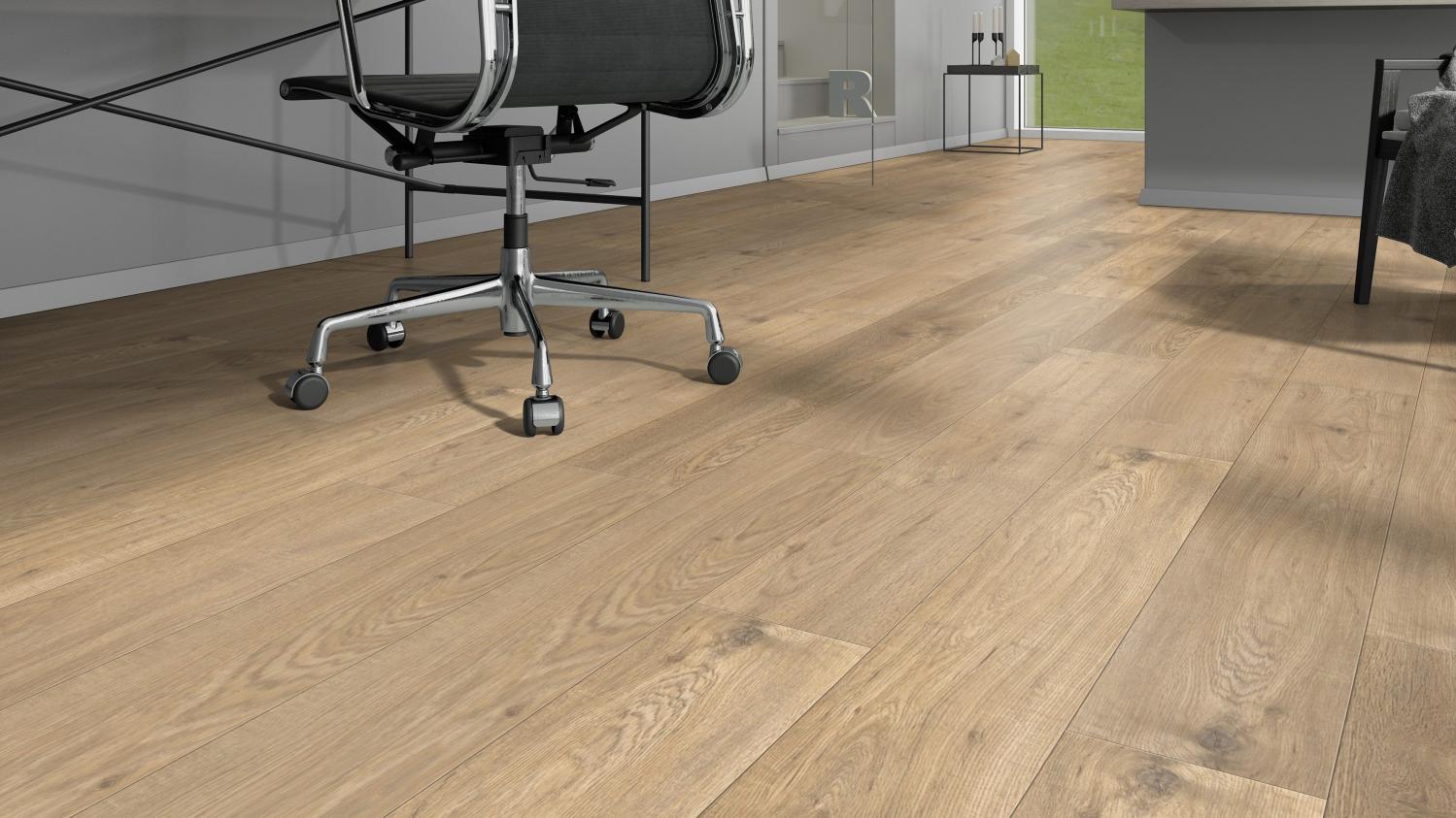 Deski podłogowe w stylu rustykalnym w naturalnych odcieniach brązu, z fazą, nadają pomieszczeniu wyjątkowo przyjazny i ciepły charakter. Dzięki wyraźnym sękom i pęknięciom naturalny wygląd tego charakterystycznego dębu jest umiejętnie podkreślony.