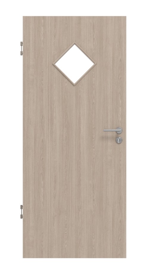 Okno w kształcie rombu jest wizualnym punktem centralnym skrzydła drzwiowego. To interesująca alternatywa dla bulajów, która wpuszcza trochę światła do Twojego pomieszczenia.