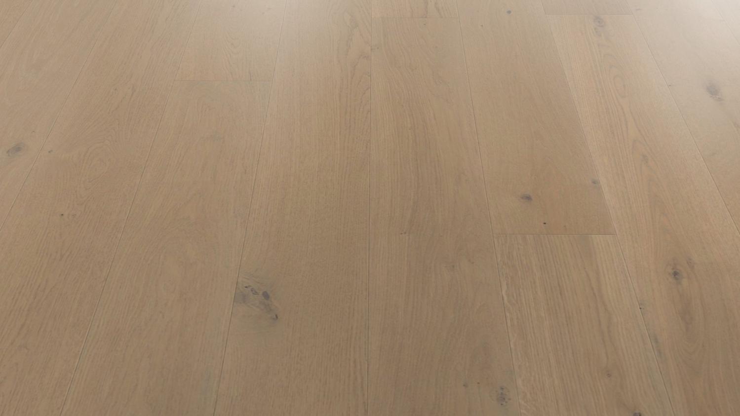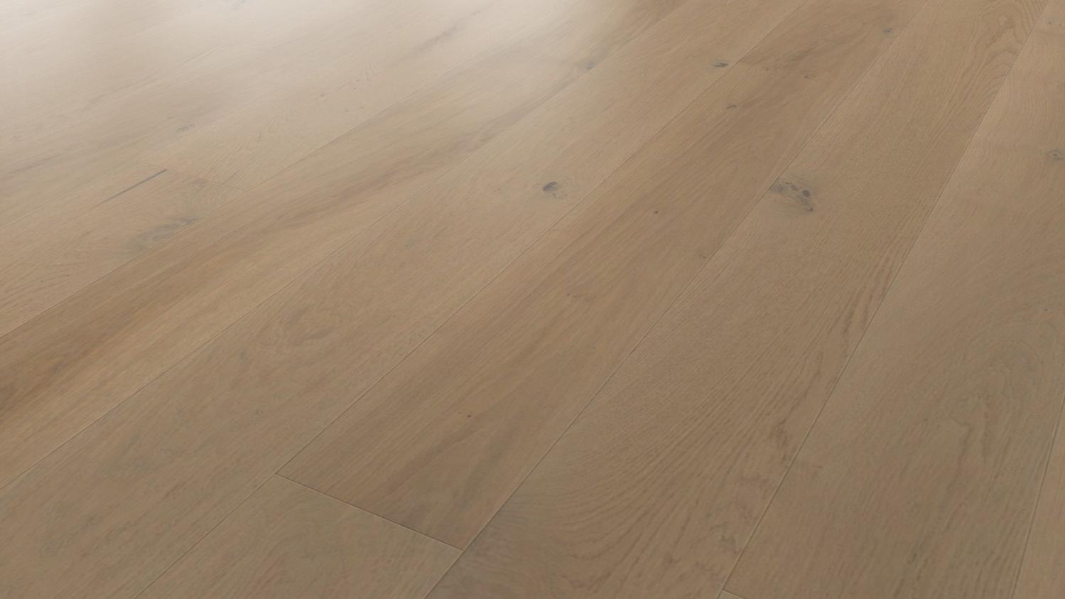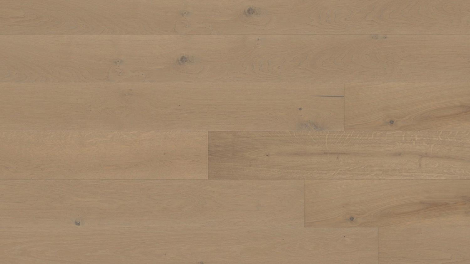 Ciesz się urokiem prawdziwej drewnianej podłogi: Dzięki parkietowi dębowemu strukturyzowanemu w kolorze piaskowo-szarym Sauvage z serii 4000 deski w stylu rustykalnym firmy Haro jesteś o krok bliżej natury.
