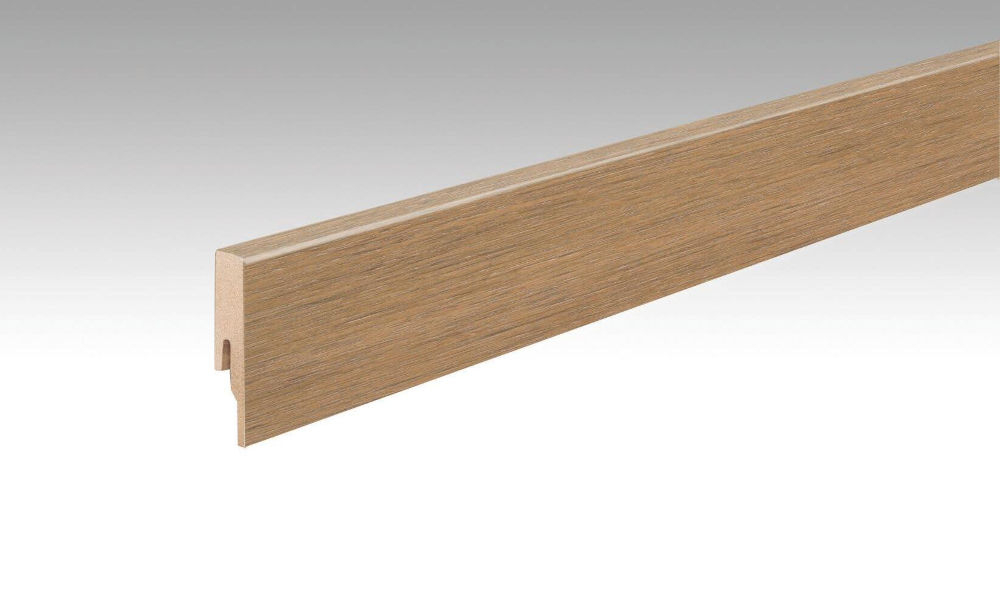 Uzupełnij to: Listwa przypodłogowa dębowa w kolorze koniakowym z linii 20 PK firmy MEISTER zapewnia idealne przejście od podłogi do ściany.