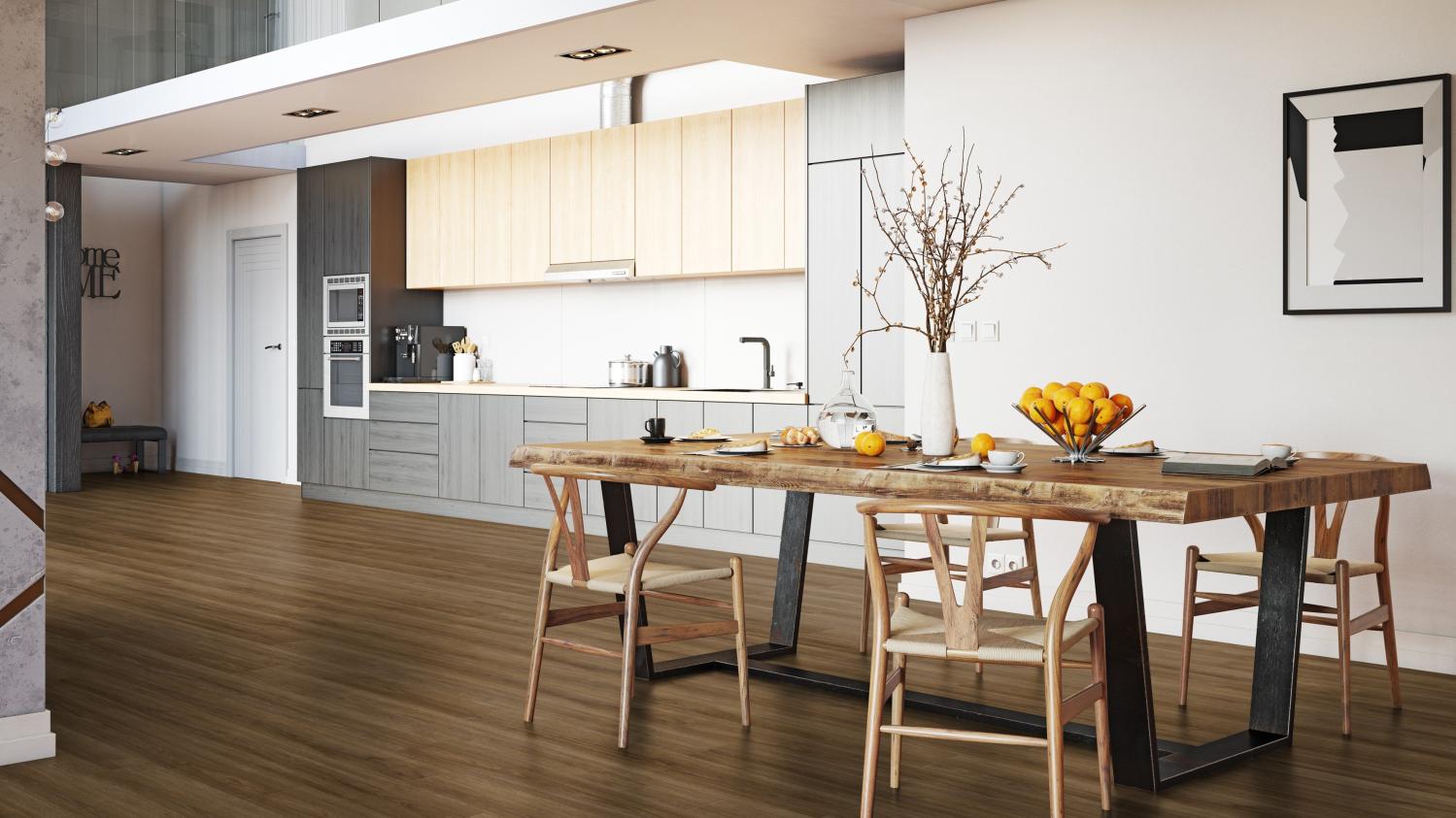 Te deski podłogowe w stylu rustykalnym w ciemnych odcieniach i z fazowaniem nadają pomieszczeniom stylowy charakter. Delikatne usłojenie podkreśla naturalny wygląd dębowego drewna.