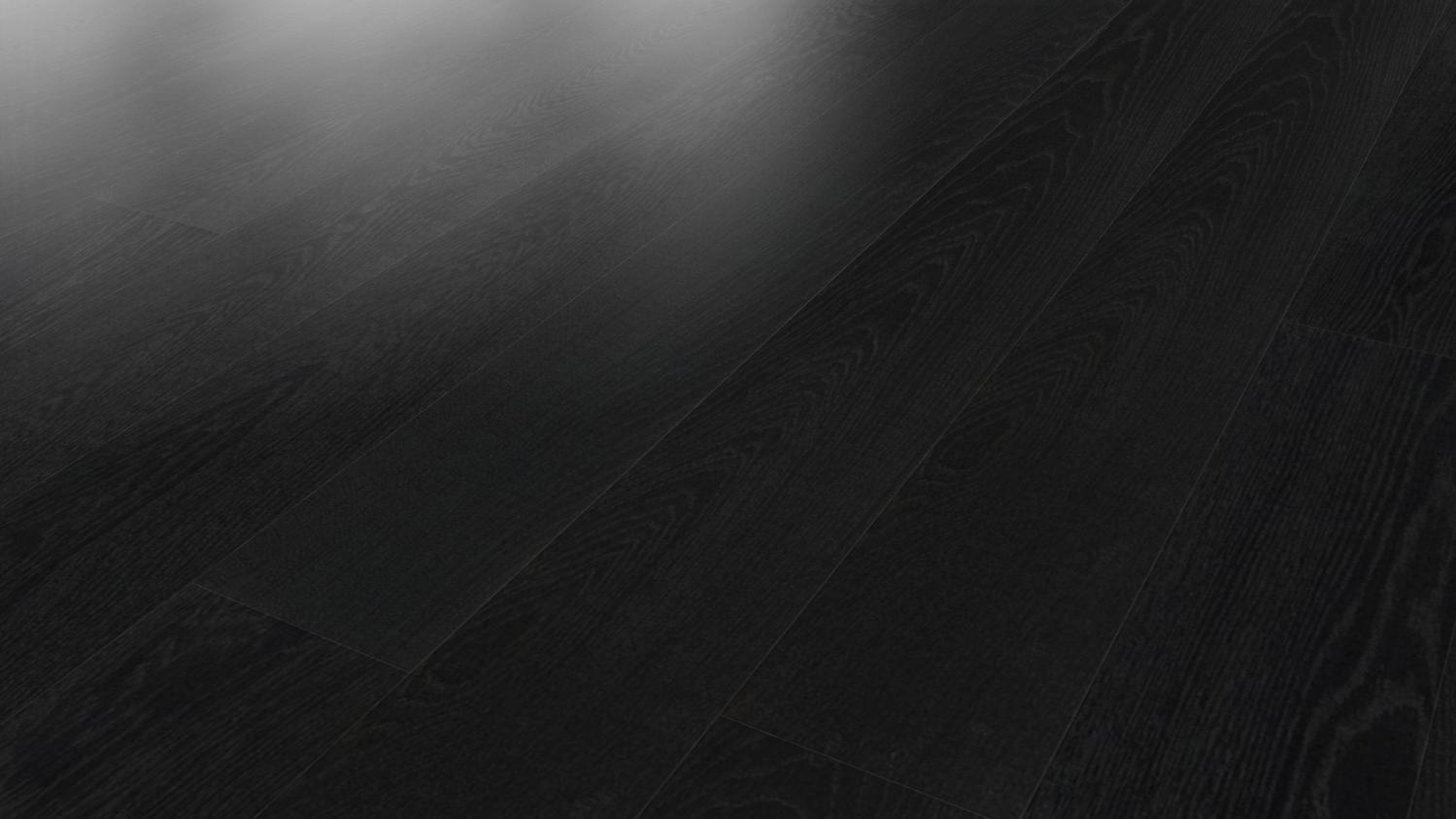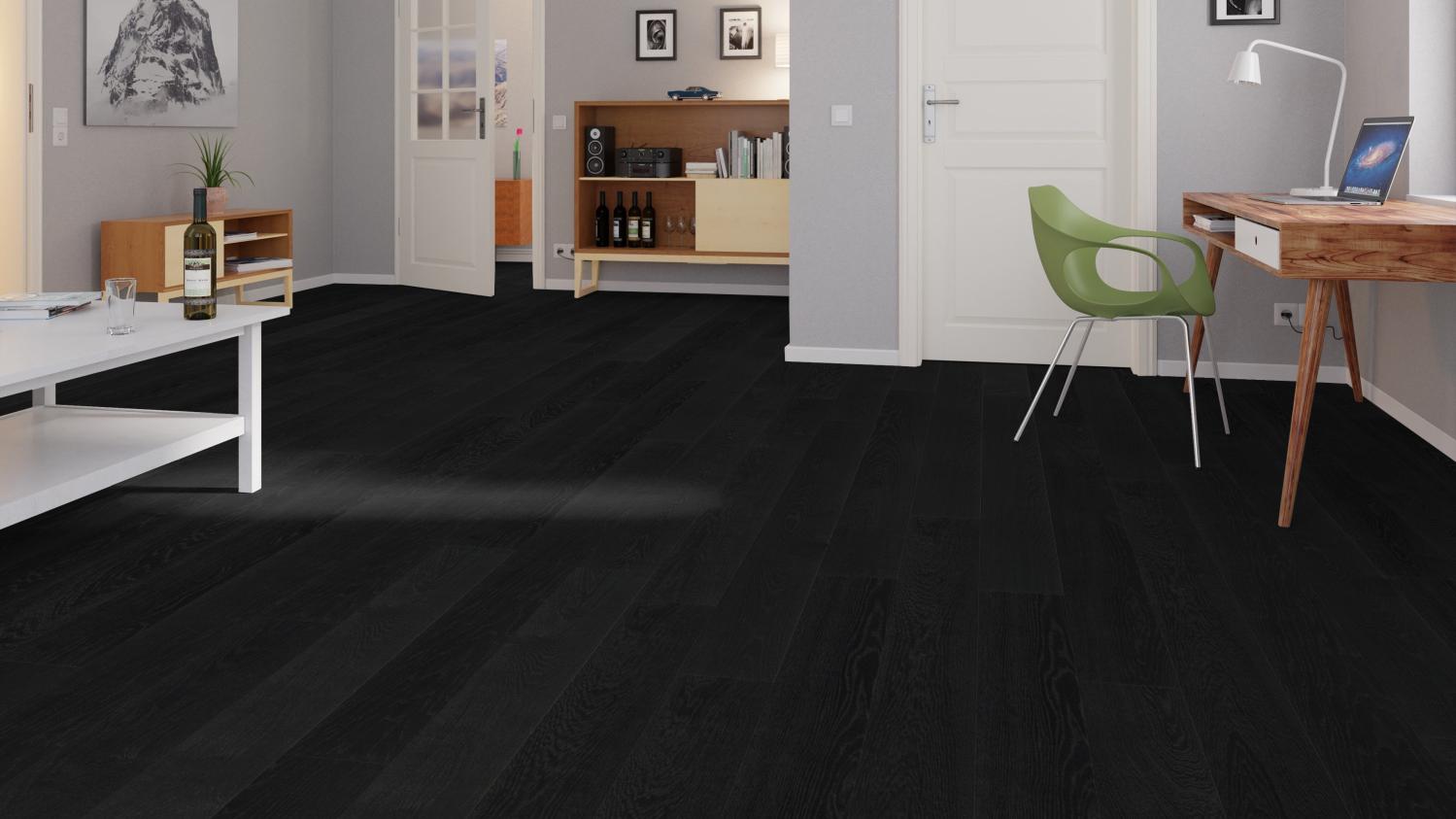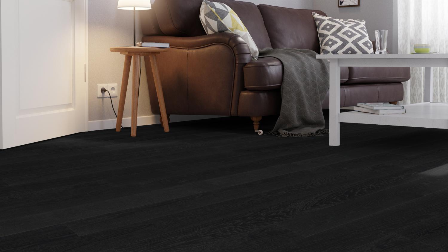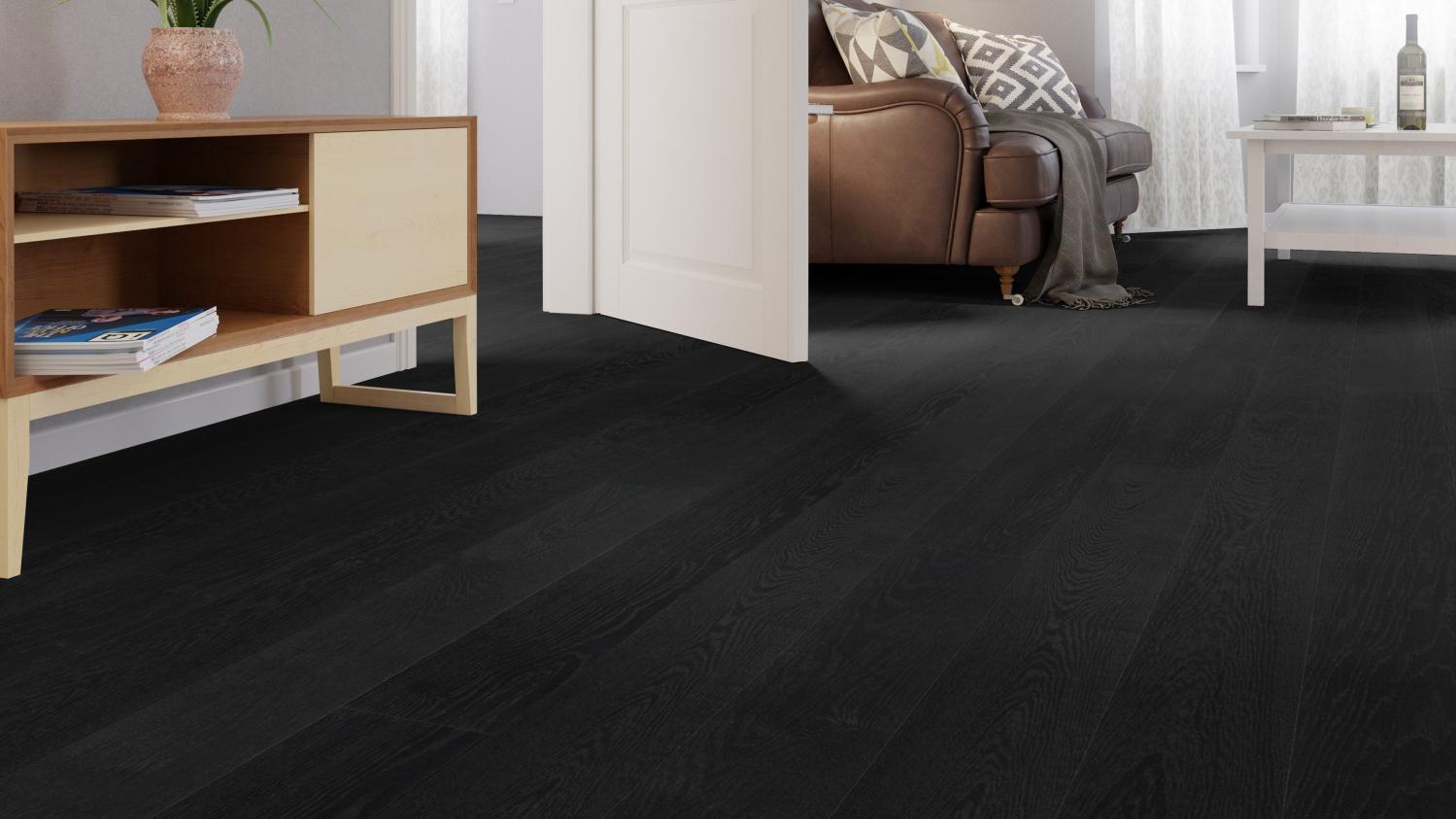 Klasyczna podłoga drewniana do Twojego salonu: Dzięki parkietowi dębowemu w kolorze czarnego węgla Selectiv strukturyzowanemu przez oleoverę z serii parkettmanufaktur firmy Haro otrzymasz stylową i trwałą podłogę.