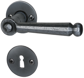Półzestaw jednostronny z czernionej satynowanej stali charakteryzuje się okrągłymi rozetami i uroczo zdobioną klamką .
