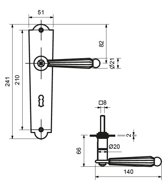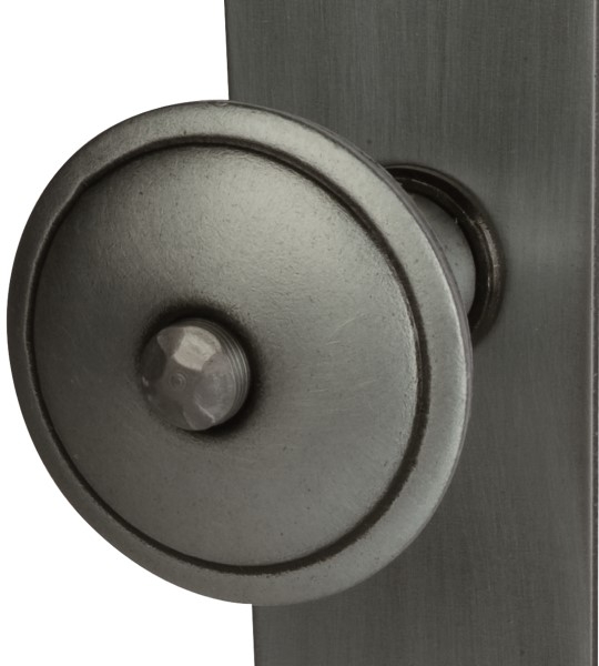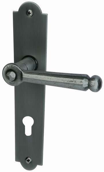 Trwale zamocowany przycisk z czernionej satynowanej stali dzięki drobnym frezom nadaje mu historyczny charakter. Wnętrze zestawu charakteryzuje się klasyczną tarczą długą z łukami i klamką w kształcie litery L. Dzięki stabilnej konstrukcji stalowej klamka drzwiowa bez problemu wytrzymuje nawet długotrwałe obciążenia.