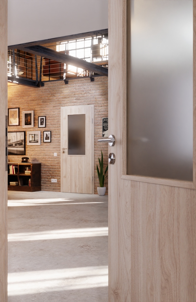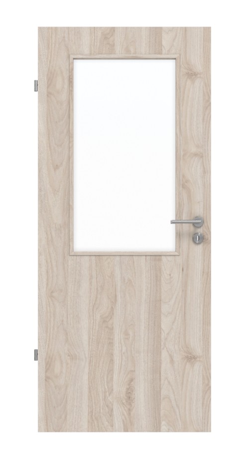 Jasna powierzchnia w kolorze Orzech Columbia tworzy przyjazną atmosferę w pomieszczeniu. W górnej części skrzydła drzwiowego znajduje się przeszklenie, które zapewnia jasność pomieszczenia. W cenie zawarte jest szklenie.