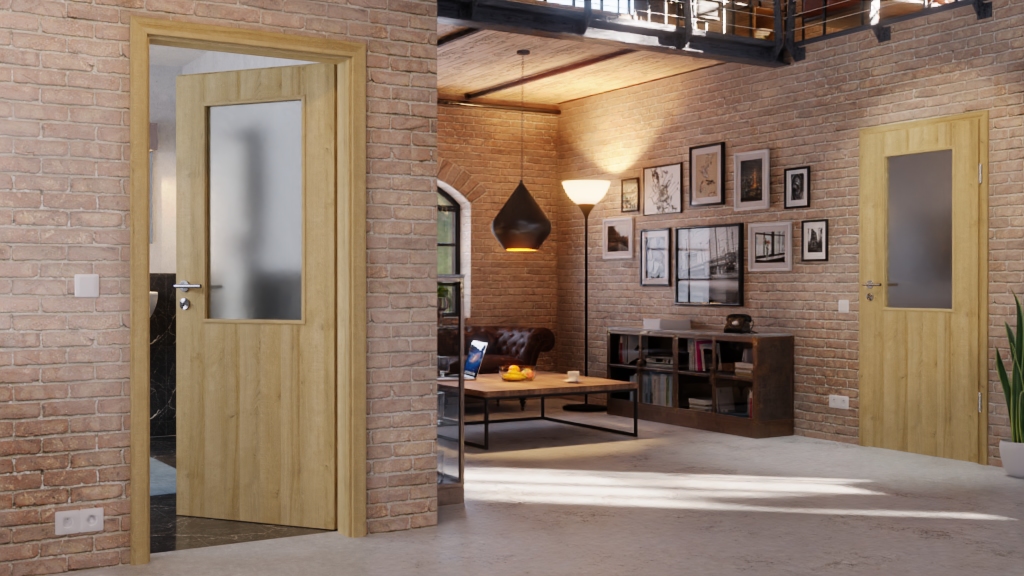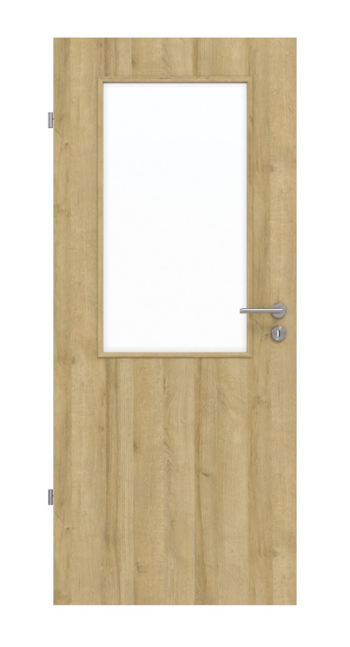 Dzięki powierzchni w kolorze Dąb Riviera masz gwarancję, że Twój dom zyska ciepły wygląd. Dodatkowo w górnej części skrzydła drzwiowego znajduje się centralne przeszklenie. Szkło zawarte jest zawarte w cenie produktu.