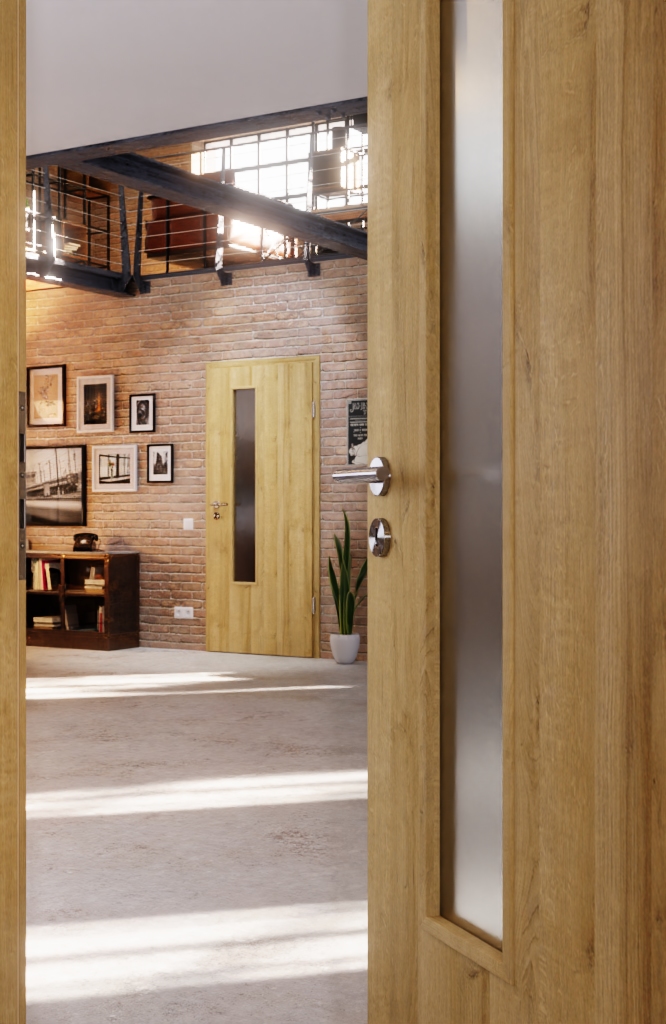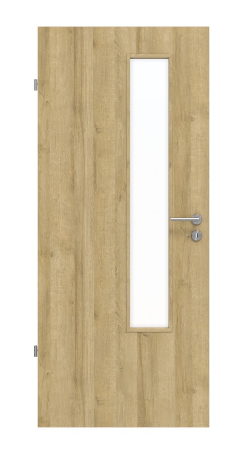 Wewnętrzna część drzwi posiada niewielkieprzeszklenie, które dyskretnie wpuszcza światło do pomieszczenia. Dodatkowo kolor dąb Riviera nadaje powierzchni ciepły odcień.