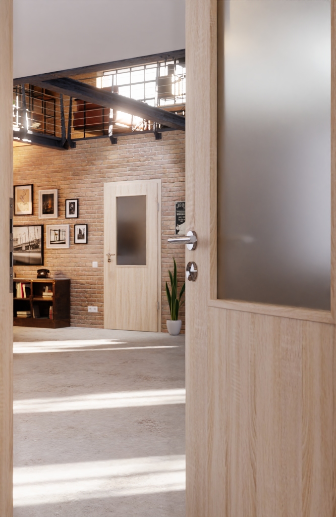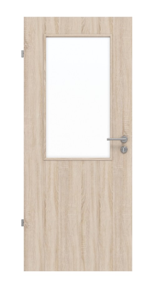 Dzięki powierzchni w kolorze Dąb Sonoma masz gwarancję, że Twój dom będzie ciepły i przytulny. Dodatkowo w górnej części skrzydła drzwiowego znajduje się przeszklenie umieszczone pośrodku. Szkło zawarte jest zawarte w cenie produktu.