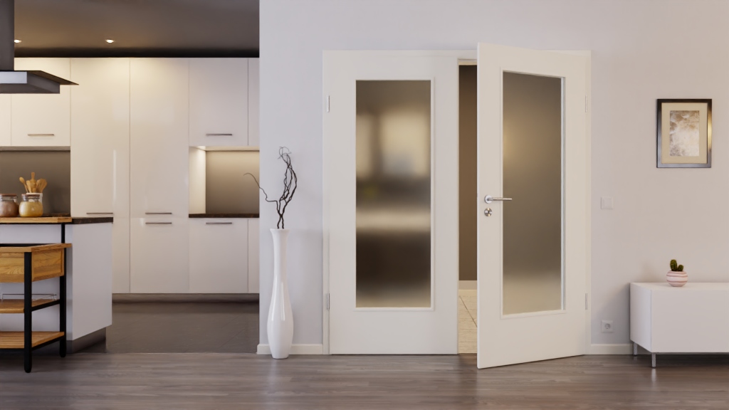 Dzięki dwóm dużym przeszkleniom do wnętrza domu wpada dużo światła. Masz do wyboru szkło przezroczyste lub satynowane. Białe wykończenie nadaje dwuskrzydłowemu skrzydłu drzwiowemu nowoczesny wygląd.