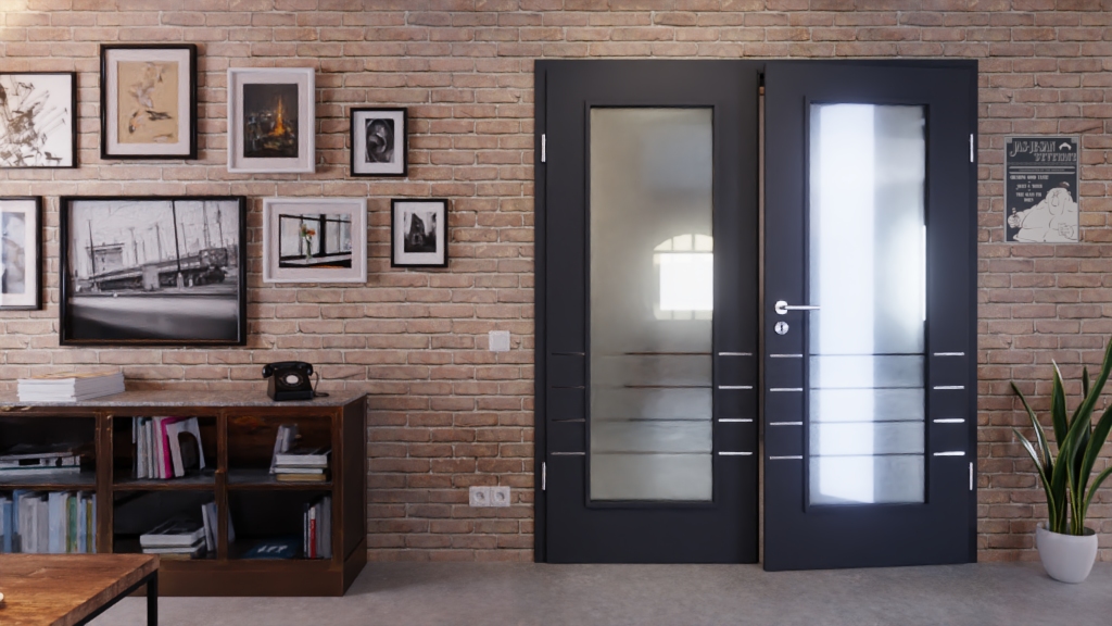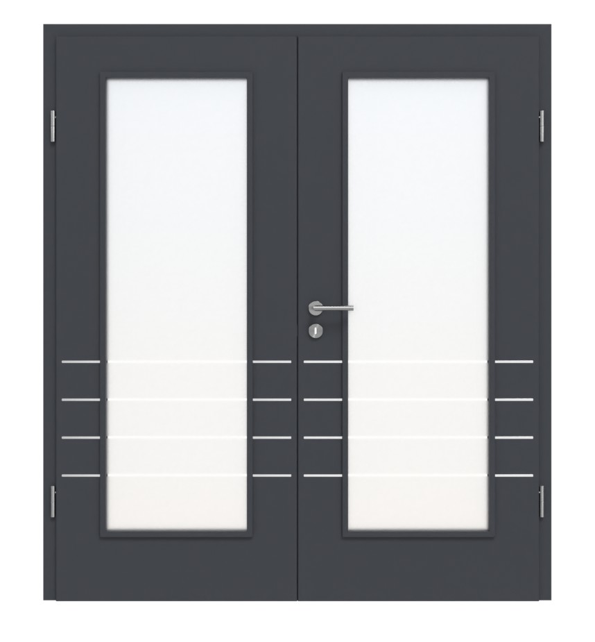 Ciemna warstwa wierzchnia nadaje wnętrzu nowoczesny charakter i tworzy w nim intrygującą atmosferę. W przypadku szkła ESG w przeszkleniu możesz wybierać między wykonaniem przezroczystym a satynowanym. Dodatkowo w dolnej części każdego skrzydła drzwiowego przebiegają cztery poziome pasy.