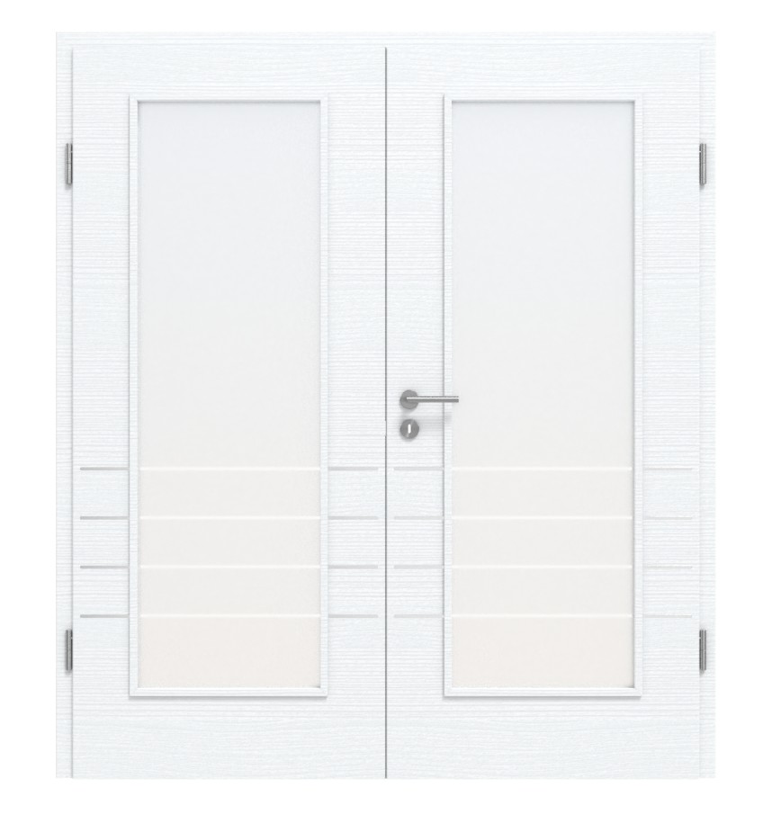 Centralny punkt drzwi dwuskrzydłowych stanowią dwa duże szklenia, które wpuszczają mnóstwo światła do pomieszczenia. Zaleta: Niezbędne szklenie jest już wliczone w cenę. Ponadto w dolnej części każdego skrzydła drzwiowego znajdują się cztery pasy. Sama warstwa wierzchnia ma fakturę.