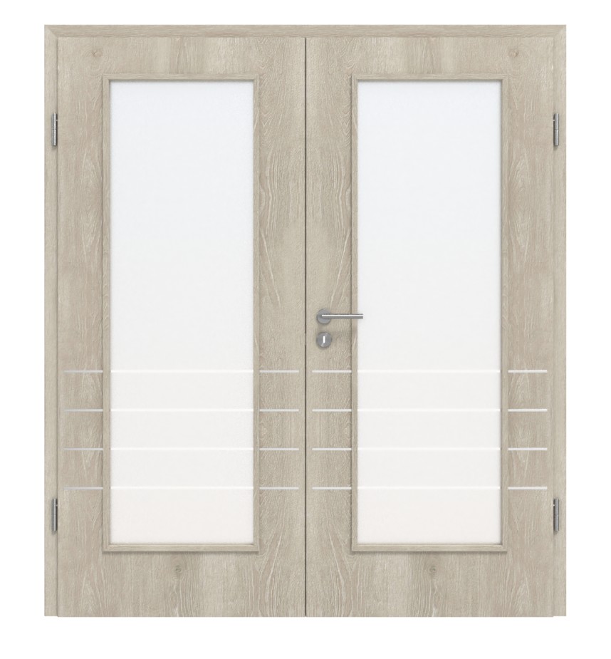 Żywa powierzchnia dekoracyjna w optyce drewna tworzy naturalny design. Dodatkowo w dolnej części każdego skrzydła drzwiowego wykonano cztery pasy, które umiejętnie ożywiają wnętrze. Jednak największą zaletą drzwi dwuskrzydłowych są duże przeszklenia. Szkło jest wliczone w cenę.