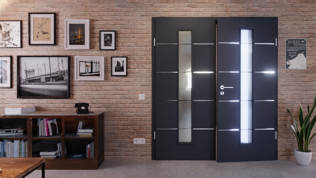 Ciemna powłoka tworzy nowoczesny klimat wnętrza, który na długo pozostaje w pamięci. Dodatkowo stosuje się cztery paski . Wąskie, wyśrodkowane przeszklenia umiejętnie dopełniają całościowy wygląd.