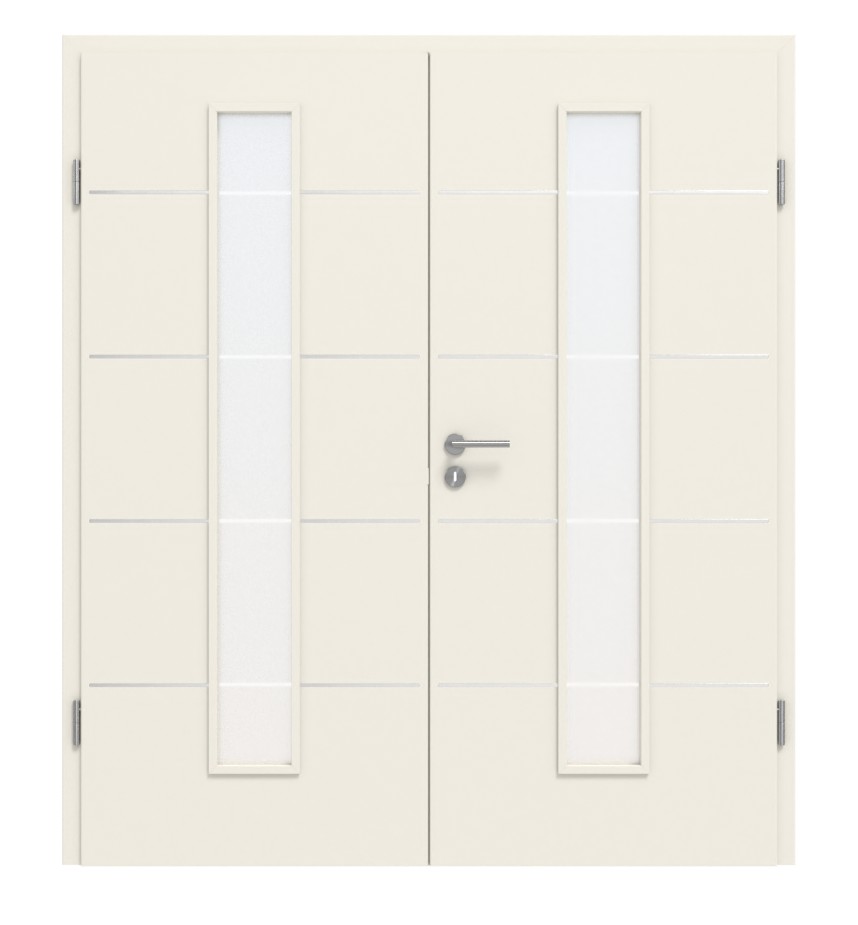 W przypadku tych drzwi dwuskrzydłowych najważniejsza jest integracja dwóch elementów: Z jednej strony biała powierzchnia emanuje harmonijnym urokiem. Z drugiej strony wąskie wycięcie na szybę pośrodku zapewnia nieco światła w pomieszczeniu. Cztery wzdłużne paski pełnią rolę łącznika między tymi dwoma elementami.