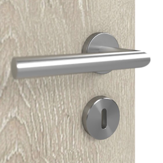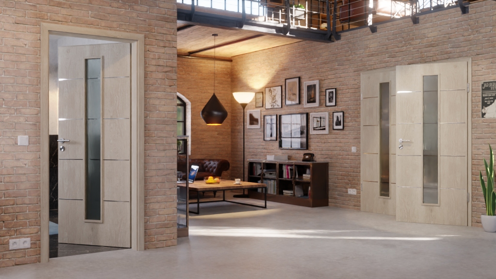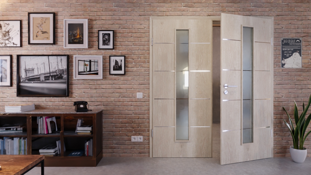 Skrzydła drzwiowe składają się z dwóch elementów. Po pierwsze, dzięki żywej powierzchni imitującej drewno stawiasz na naturalny design. Z drugiej strony, wyśrodkowane, wąskie przeszklenia wpuszczają do pomieszczenia nieco światła. Te dwa elementy są optycznie połączone za pomocą czterech pasków.