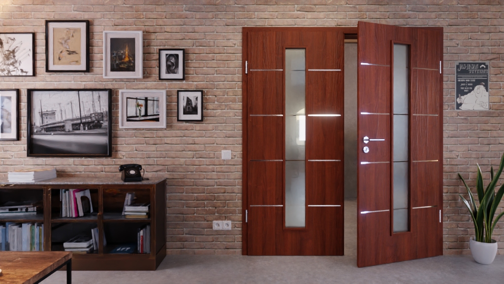 Na skrzydłach drzwiowych umieszczono wąskie, wycentrowane przeszklenie, które zapewnia delikatną wymianę światła między pomieszczeniami. Wykończenie orzechowe jest ciepłe i dzięki temu sprawia wrażenie przytulnego. Oba elementy są optycznie połączone czterema paskami.