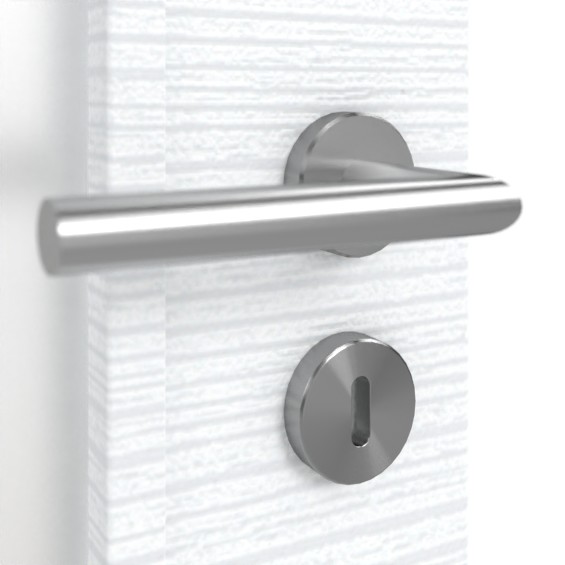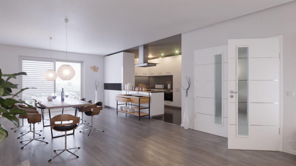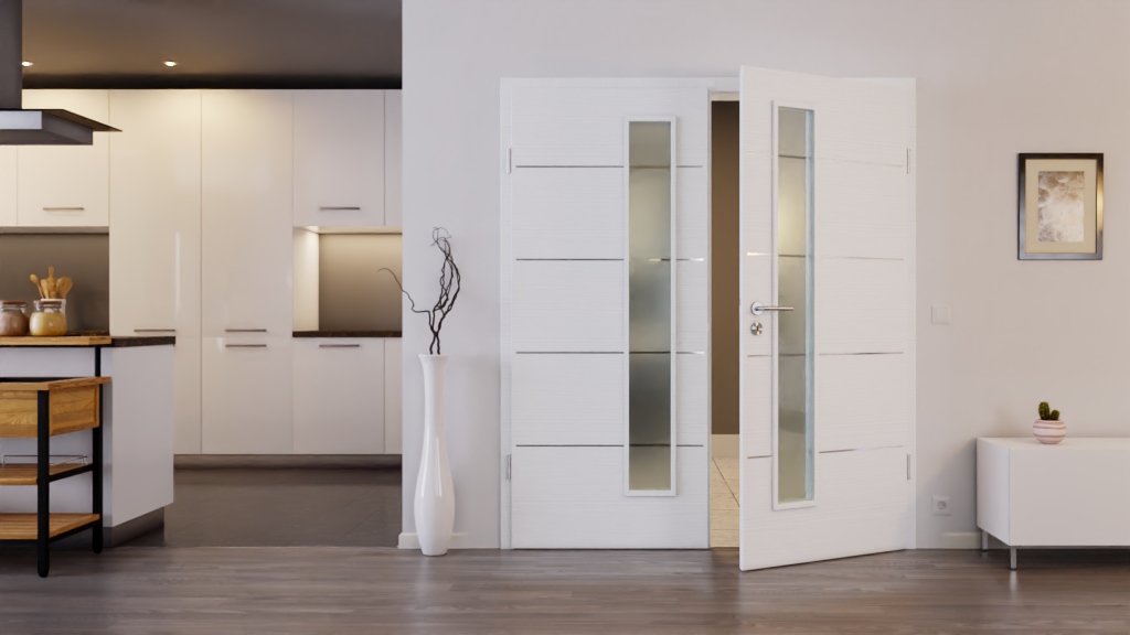Drzwi dwuskrzydłowe składają się z trzech elementów: Biała, teksturowana powierzchnia emanuje energią. Po stronie zamka zastosowano dodatkowo wąskie przeszklenia, które dyskretnie przepuszczają światło. Ponadto w poprzek każdego skrzydła drzwiowego biegną cztery poziome pasy.