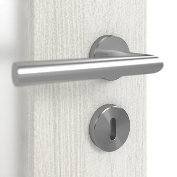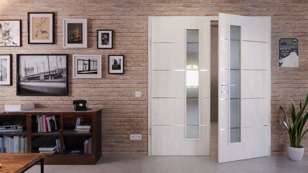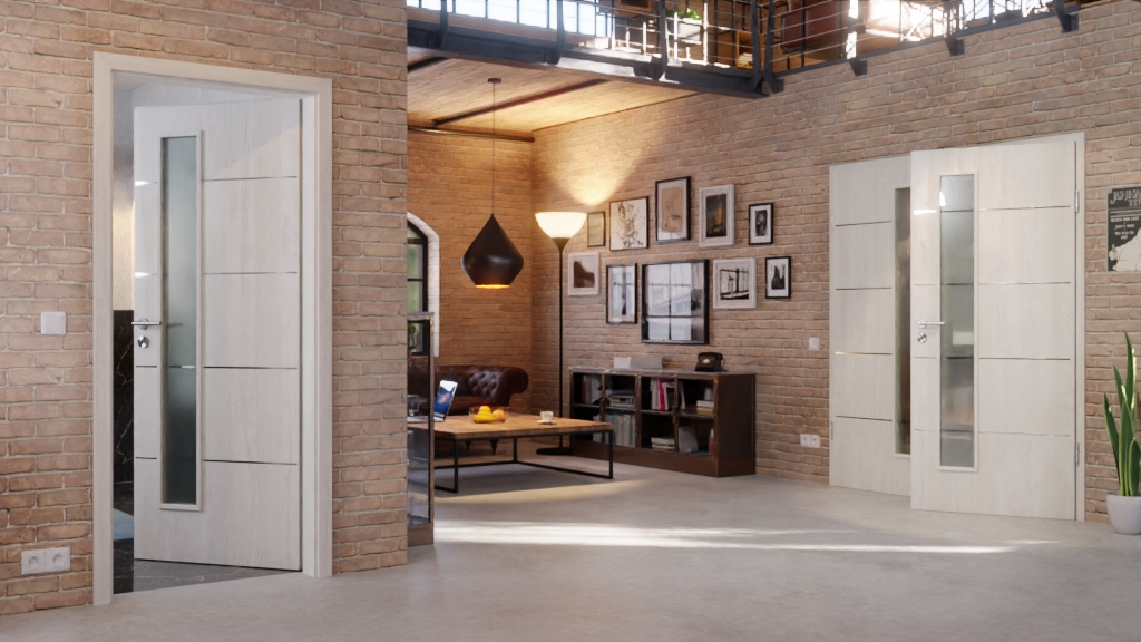 Na skrzydle drzwiowym po stronie zamka znajdują się wąskie wycięcia na szybę, które zapewniają dyskretną wymianę światła między pomieszczeniami mieszkalnymi. Dekor w kolorze jasnego jesionu jest jasny, dzięki czemu sprawia przyjazne wrażenie. Oba elementy są optycznie połączone za pomocą czterech pasków .