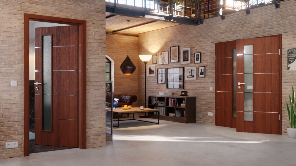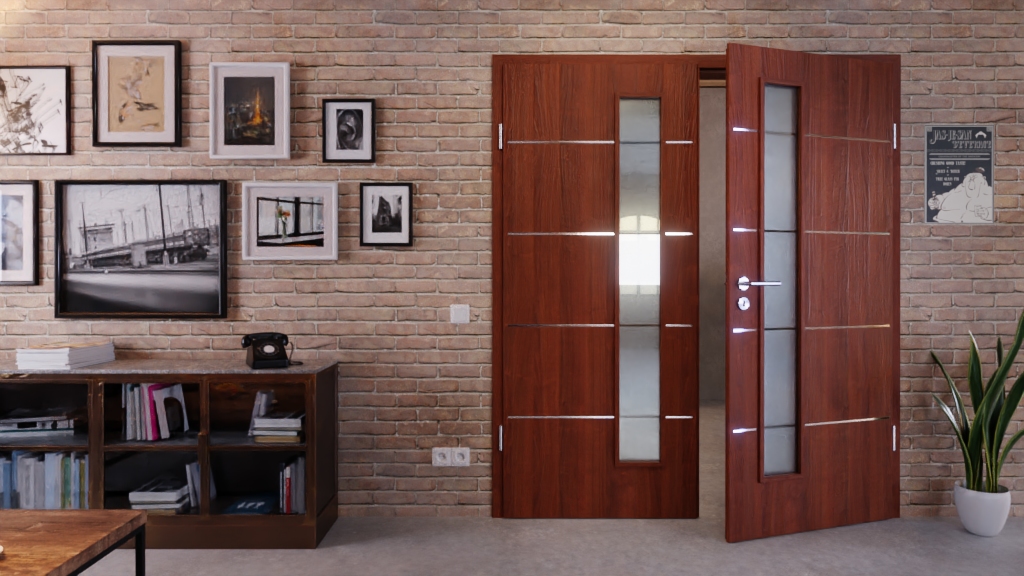 Na skrzydłach drzwiowych po stronie zamka znajdują się subtelne wycięcia na szybę, które zapewniają łagodną wymianę światła między pomieszczeniami. Dekor z orzechów ma ciepły charakter, dzięki czemu działa uspokajająco. Oba elementy są wizualnie połączone za pomocą czterech pasków .