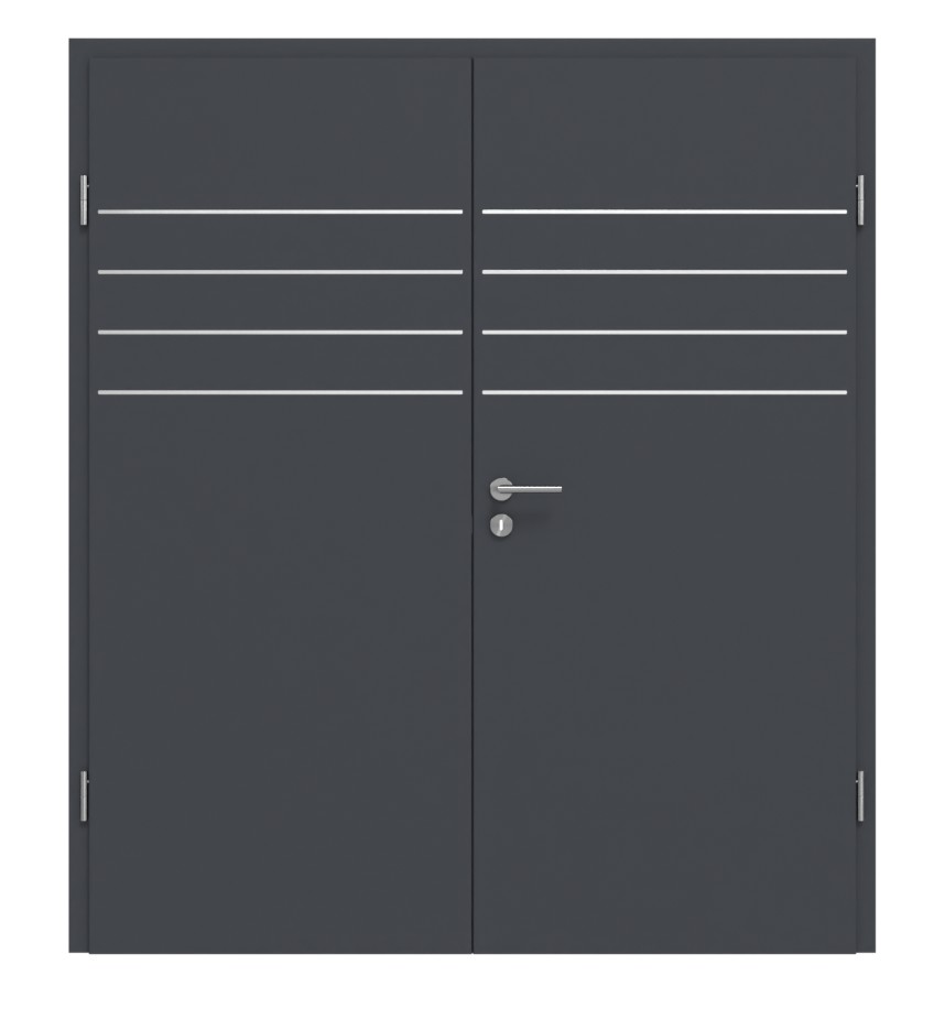 Podwójne drzwi w przystępnej cenie: Drzwi dwuskrzydłowe 4.13 z powierzchnią CPL w kolorze grafitowym podobnym do RAL 7024 firmy Classen przekonują swoją trwałością. W cenie zawarta jest już odpowiednia ościeżnica .