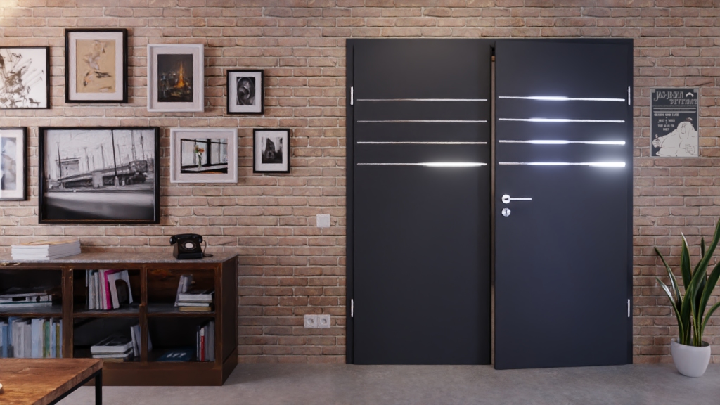 Drzwi składają się z dwóch elementów: Po pierwsze, ciemna powierzchnia stanowi modny element wystroju wnętrz. Z drugiej strony, w górnej części każdego skrzydła drzwiowego znajdują się cztery lizeny przebiegające poziomo.