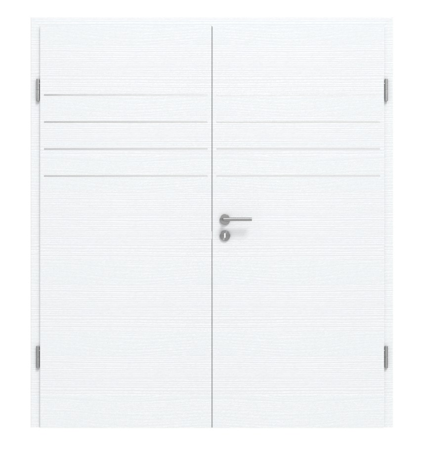 Niedroga drzwi wewnętrzne z dwoma skrzydłami: Drzwi dwuskrzydłowe 4.13 z powierzchnią CPL w kolorze bieli ze strukturą wraz z ościeżnicą firmy Classen zachwycają minimalistycznym wzorem, trwałą konstrukcją i stabilną warstwą wierzchnią.