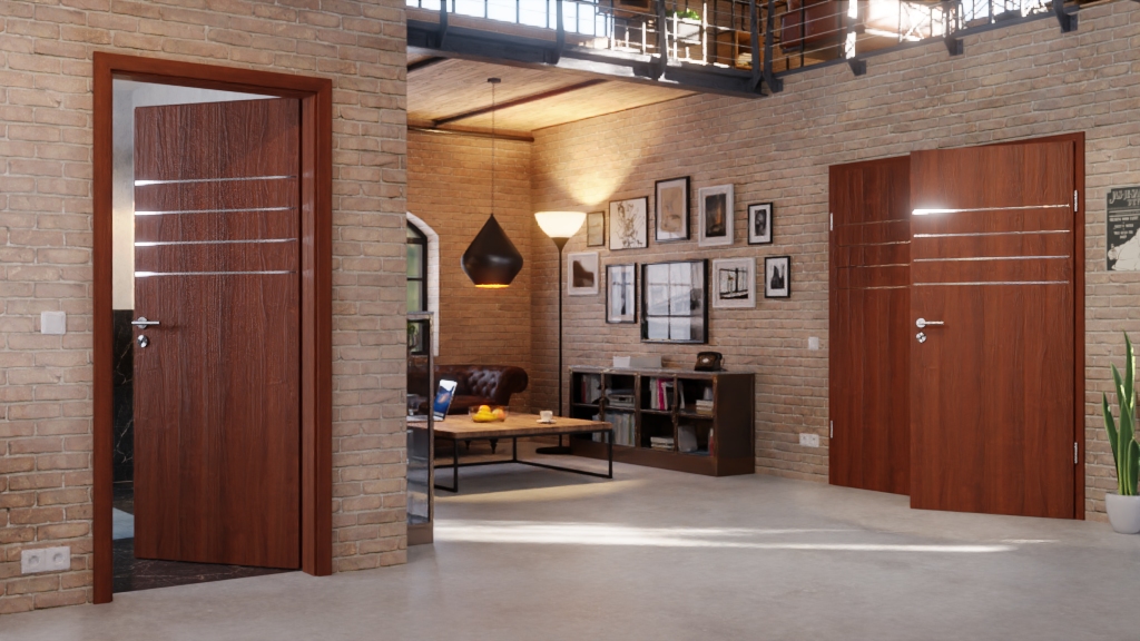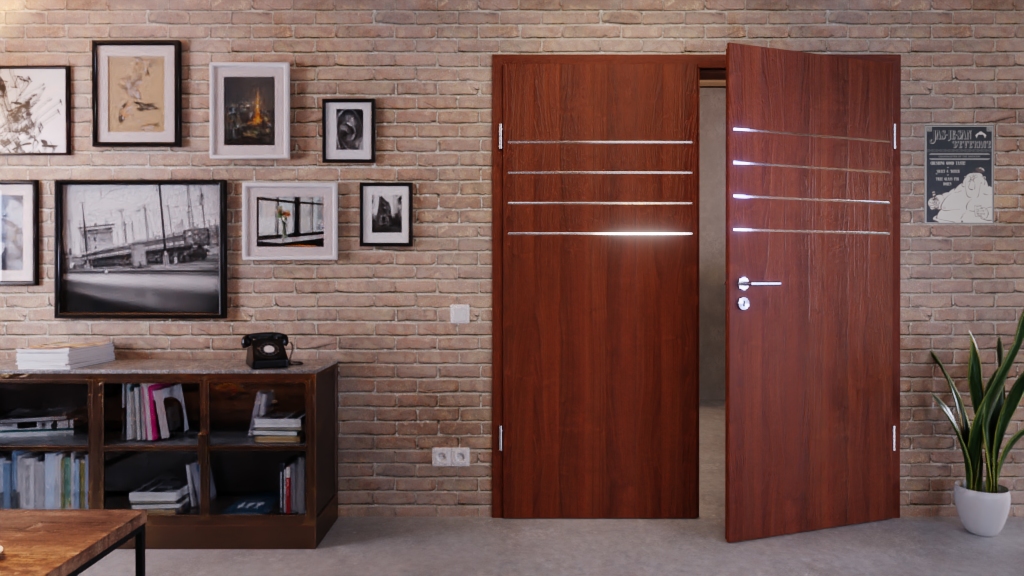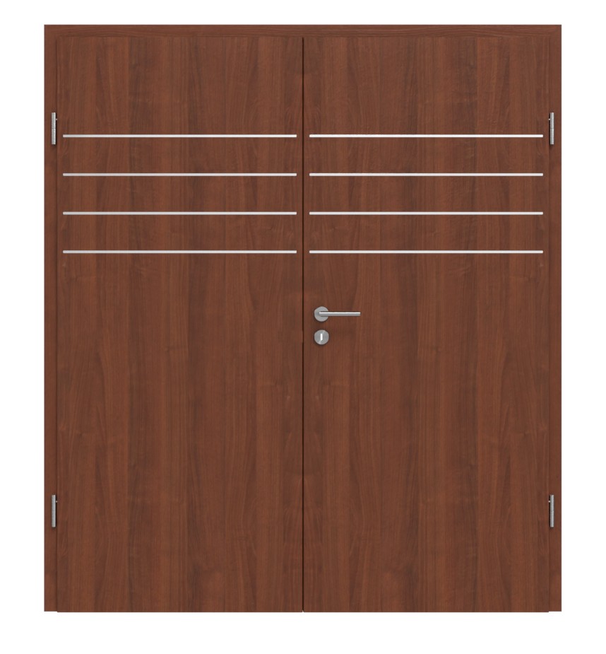 Dekor orzechowa zachwyca naturalnością i ciepłą barwą, a ponadto wygląda jak prawdziwe drewno. Do tego dochodzą cztery poziome listwy, które znajdują się w górnej części poszczególnych skrzydeł drzwiowych.