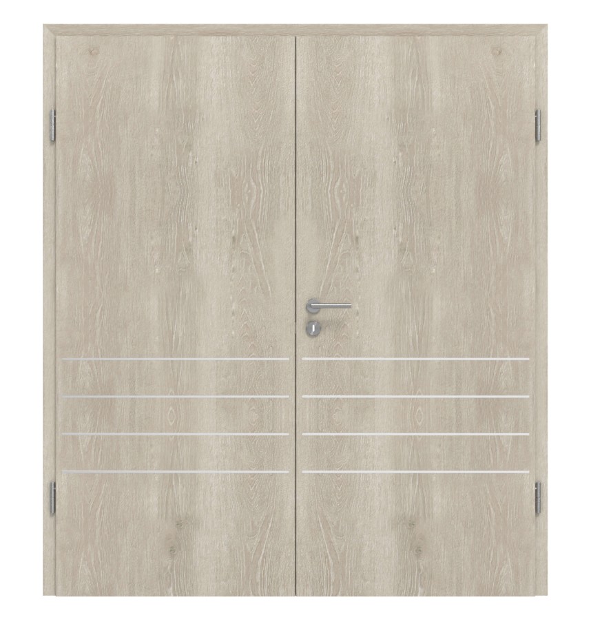 Niedrogie drzwi dwuskrzydłowe o solidnym wykonaniu: Drzwi dwuskrzydłowe 4.14 z powierzchnią CPL w kolorze dębu Kendal wraz z ościeżnicą firmy Classen idealnie dopasują się do wystroju Twojego salonu.