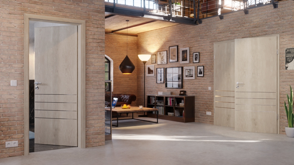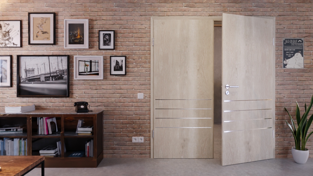 Jasny dekor dębowy zapewnia harmonijny wygląd. Jest on przełamany za pomocą czterech lizen w dolnej części każdego skrzydła drzwiowego.