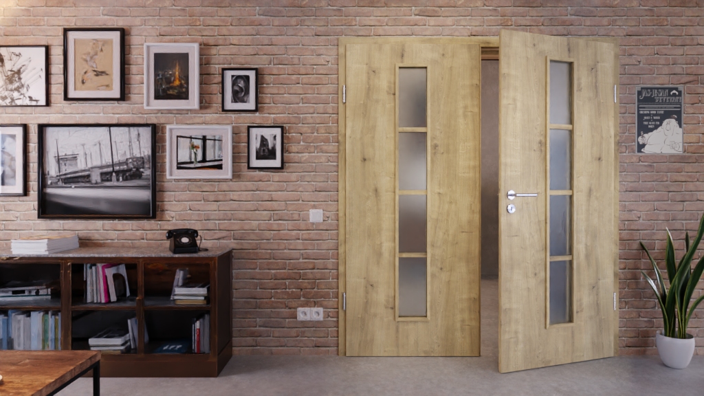 Grube słoje i wtrącenia charakterystyczne dla rustykalnego dekoru dębowego. Subtelne przeszklenia wprowadzają jasność do Twojego domu. Przy projektowaniu masz do wyboru przezroczyste szkło lub szkło matowe.