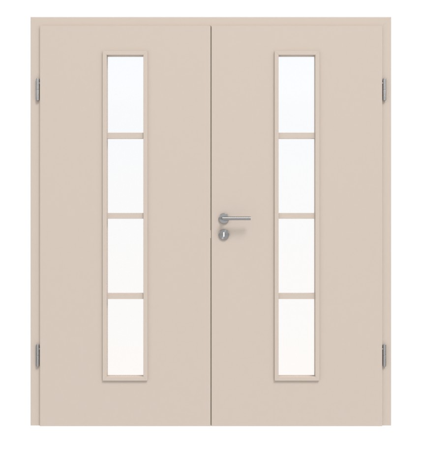 W środkowej części każdego skrzydła drzwiowego znajduje się wąskie, podzielone na cztery części przeszklenie. W przypadku szkła można wybrać między wersją przezroczystą a satynowaną. Połączenie beżowej powierzchni i szklanego otworu tworzy harmonijny design.