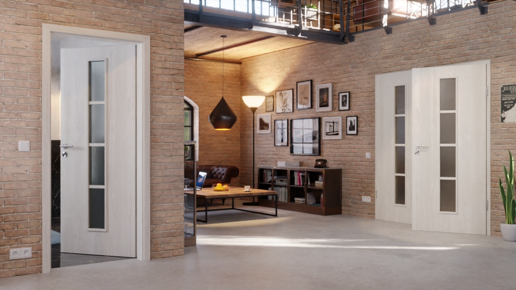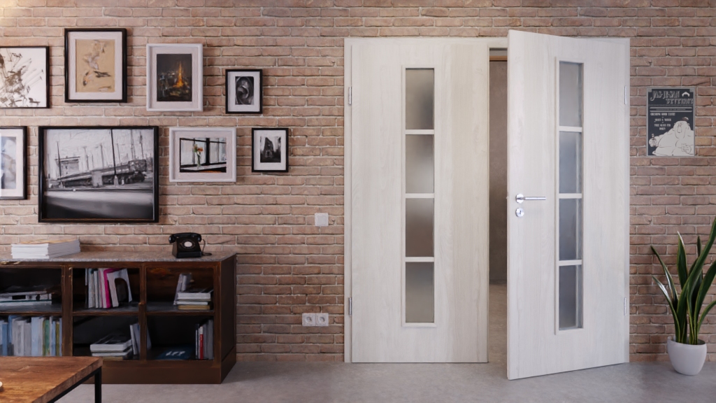 W środkowej części każdego skrzydła drzwiowego znajduje się wąski, podzielony na cztery części otwór okienny . W przypadku szkła możesz wybierać między przezroczystym wyglądem a opcją satynową. Połączenie dekoru jesionowego i przeszkleń tworzy otwarty design.