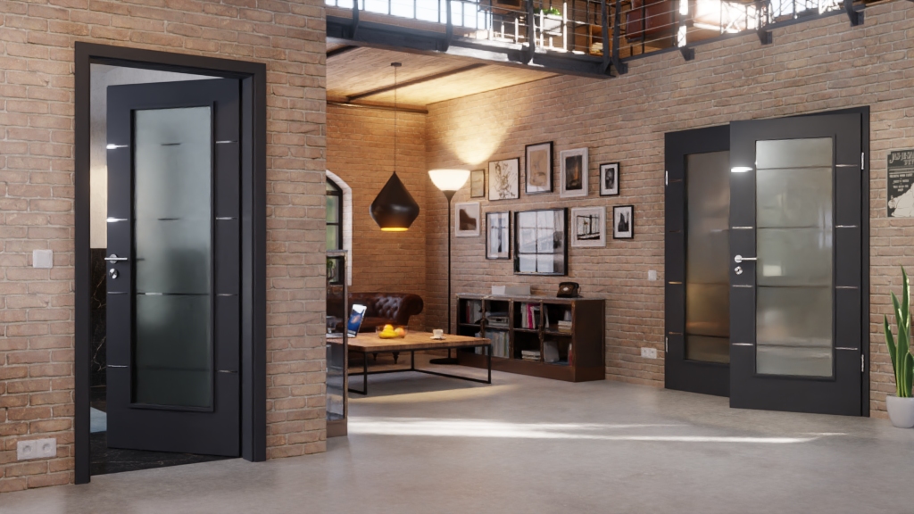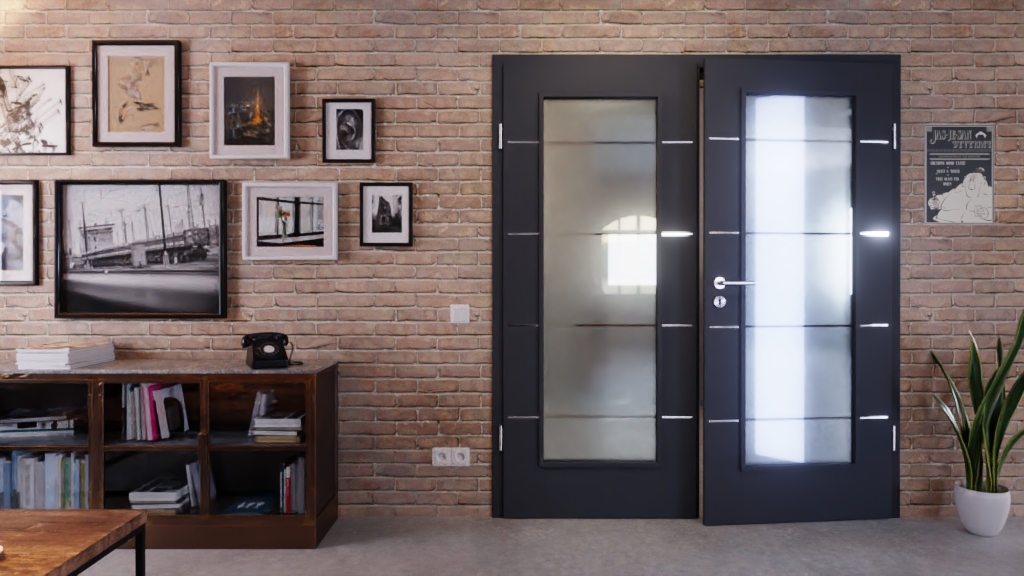 W drzwiach dwuskrzydłowych umieszczono dwa szerokie przeszklenia, które zapewniają dużą ilość światła w pomieszczeniu. Połączenie między skrzydłami drzwiowymi a szkleniami zapewniają poziome pasy.