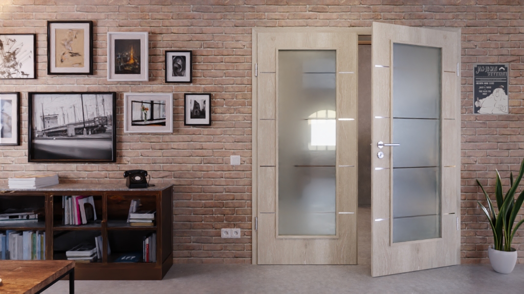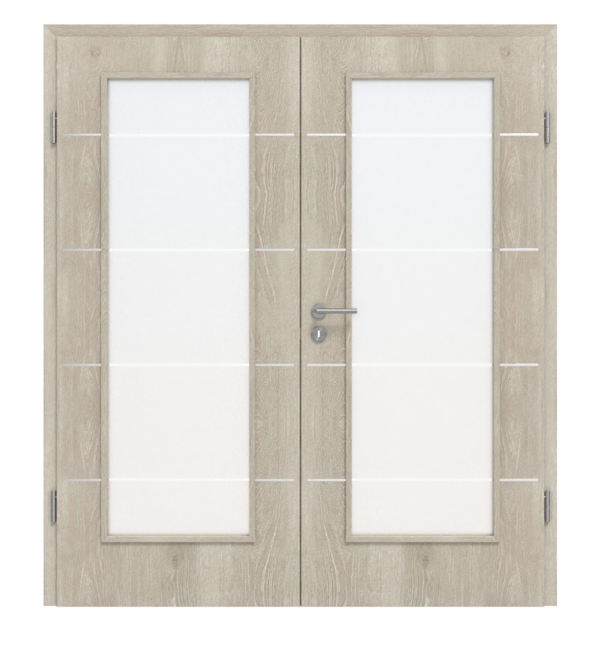 Żywy wzór drewna charakteryzuje się cieniowaniem i widocznymi słojami. Szary odcień podstawowy zapewnia elegancję, a szerokie przeszklenia nadają wnętrzu otwarty charakter. Do tego dochodzą cztery paski, które są równomiernie rozmieszczone na całym skrzydle drzwiowym.