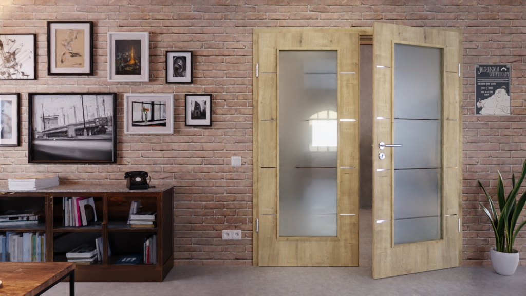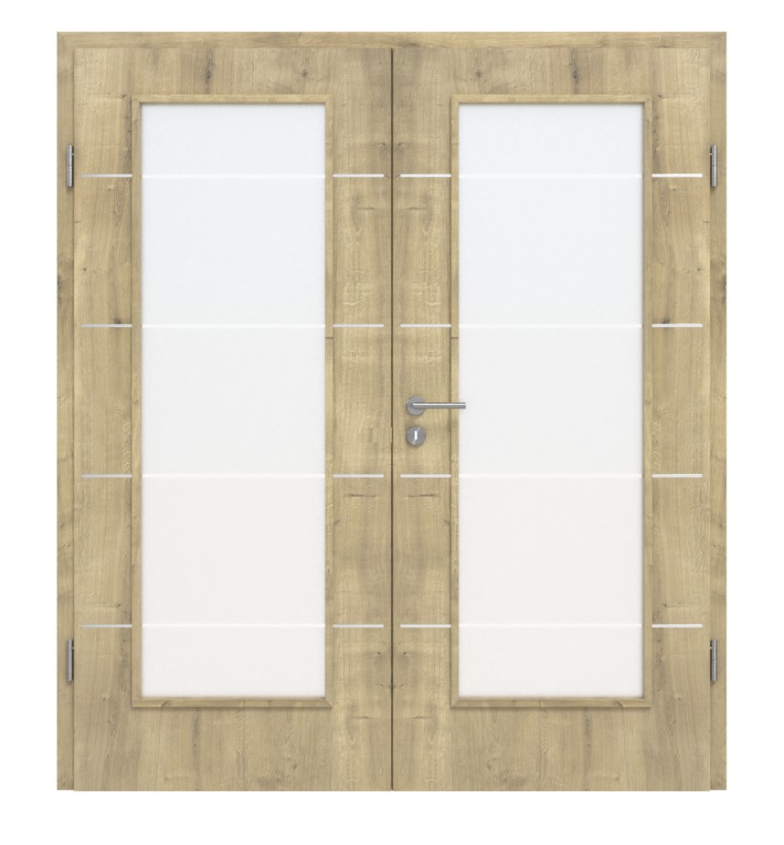 Ciepły dekor dębowy zapewnia rustykalny wygląd, który jest łagodzony przez duże przeszklenia. Przyczyniają się do tego również cztery pasy, które równomiernie biegną poziomo przez każde skrzydło drzwi i przeszklenie.