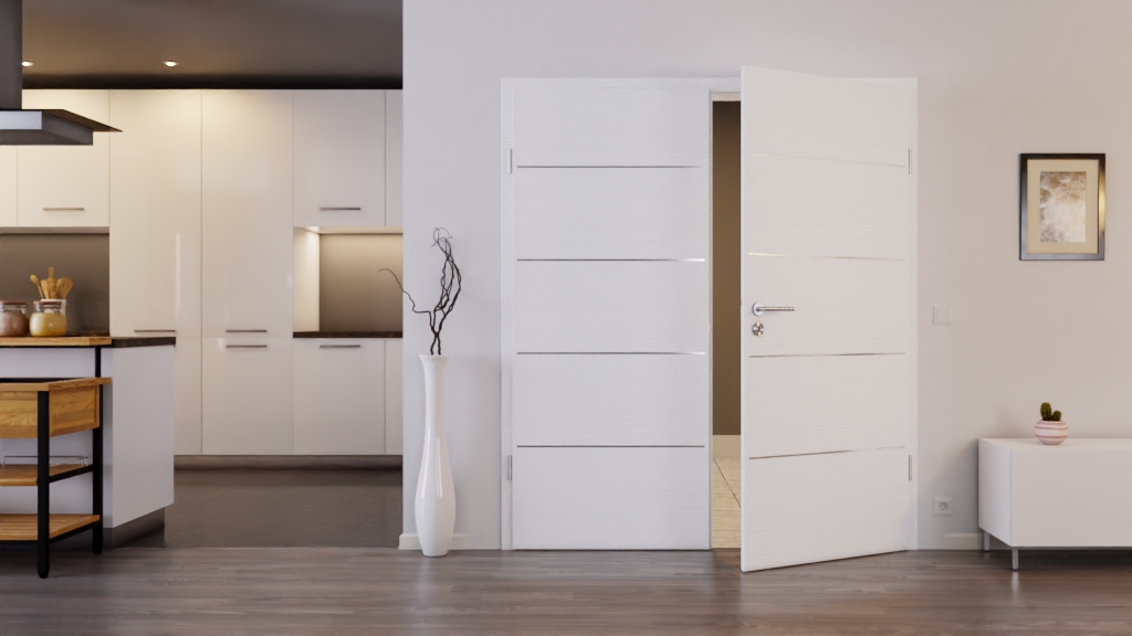 Drobne, podłużne linie nadają białym skrzydłom drzwiowym indywidualny charakter. Całościowy projekt jest udoskonalony przezcztery lizeny, które przebiegają równomiernie wzdłuż skrzydła.