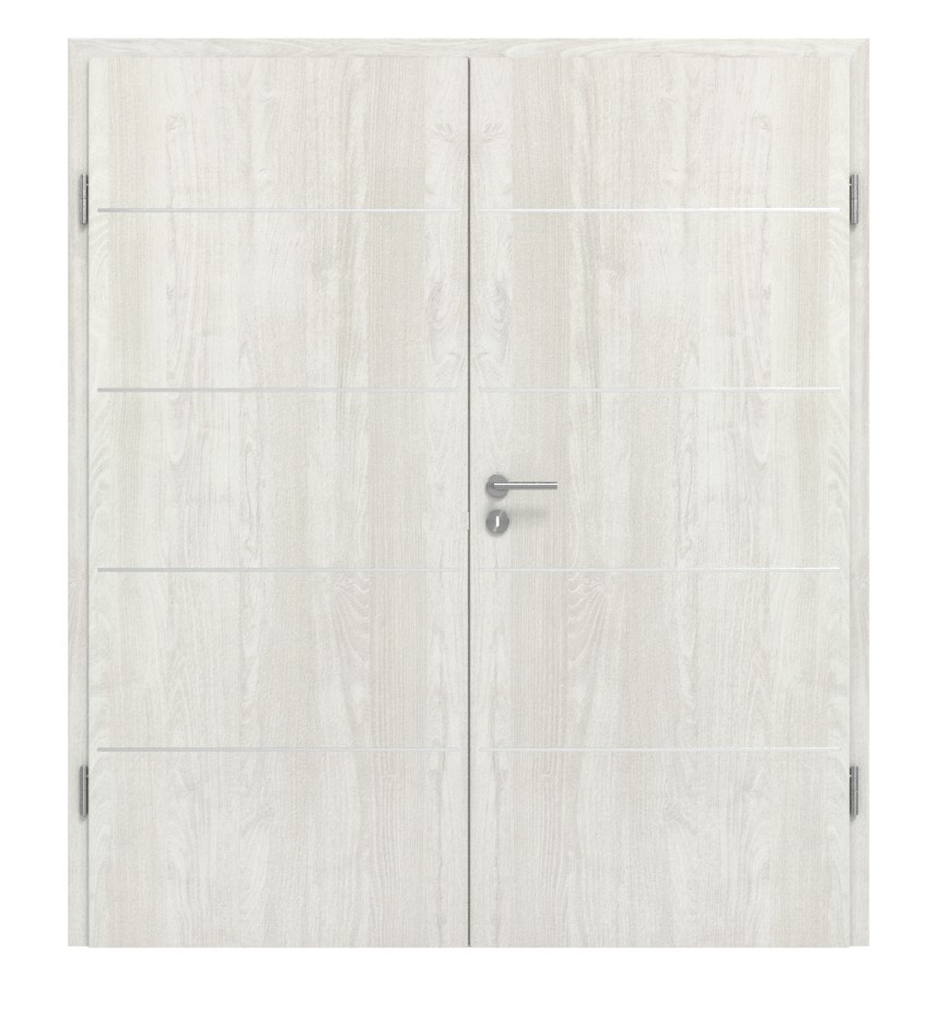 Drzwi dwuskrzydłowe zachwycają umiejętnym połączeniem jasnego wykończenia w kolorze jesionu i czterech listw. Te ostatnie rozmieszczone są równomiernie poziomo po całej powierzchni skrzydła drzwiowego.