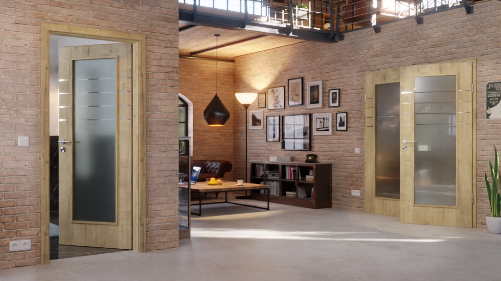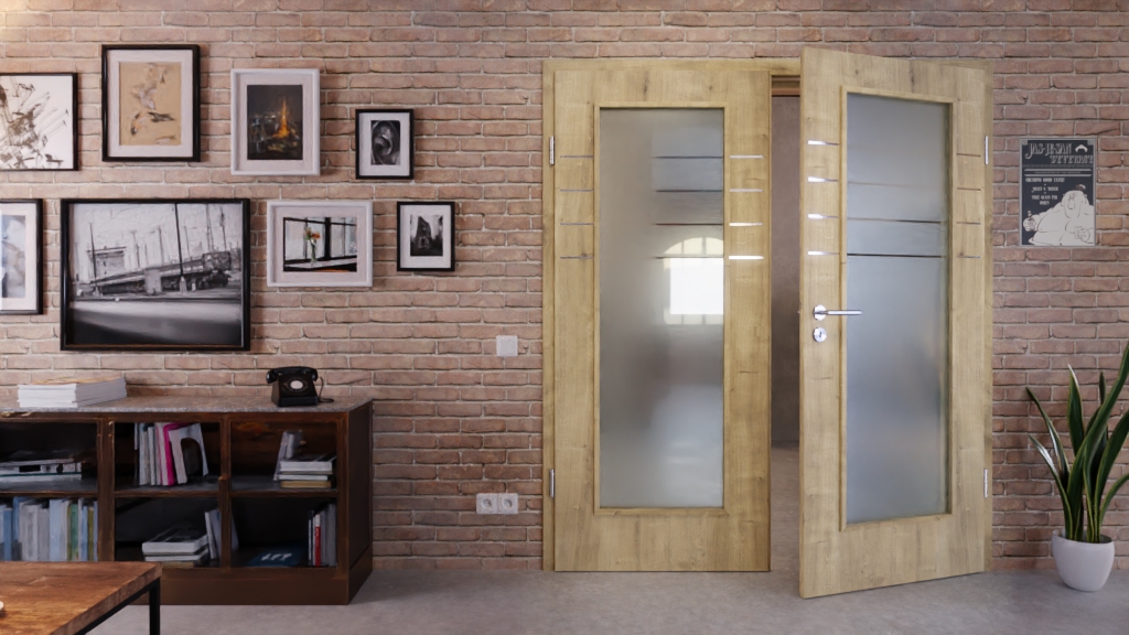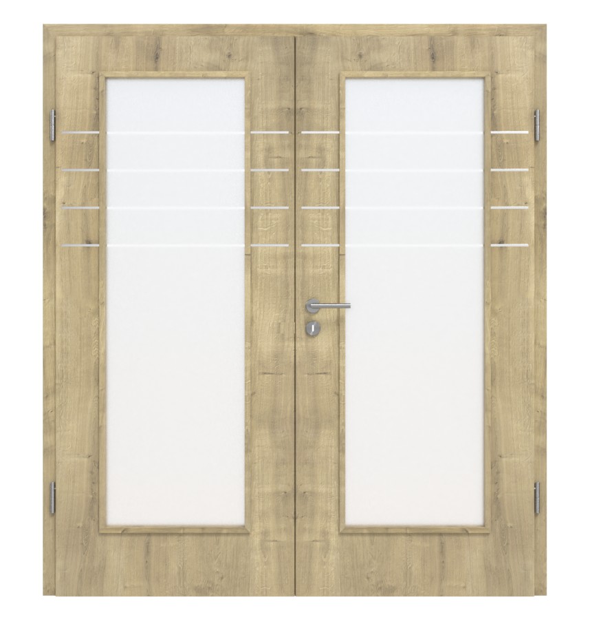 Rustykalna dekoracja dębowa zachwyca naturalnością. Dodatkowo rozległe przeszklenia wpuszczają dużo światła do pomieszczenia. Całość dopełniają cztery pasy w górnej części każdego skrzydła drzwi.