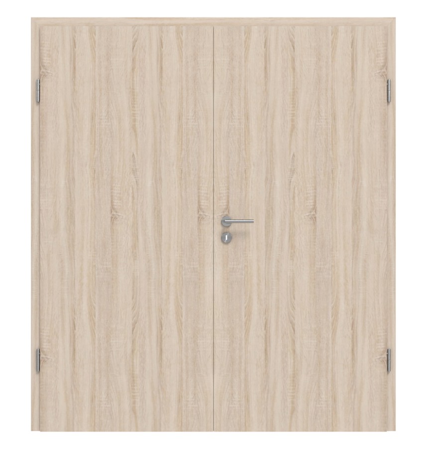 Model drzwi wewnętrznych z podwójnymi skrzydłami z ościeżnicą, kanciastymi krawędziami, zamkiem wielozadaniowym i dwuczęściowymi zawiasami: