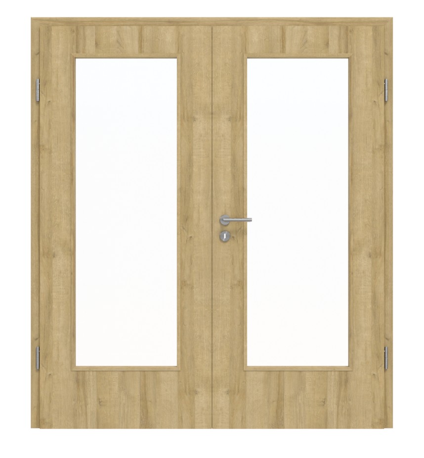 W środkowej części każdego skrzydła drzwiowego znajduje się duże przeszklenie. Odpowiednie szklenie jest już wliczone w cenę. Pozostała powierzchnia jest utrzymana w kolorze dębu Riviera, który sprawia wrażenie ciepłego i przytulnego.