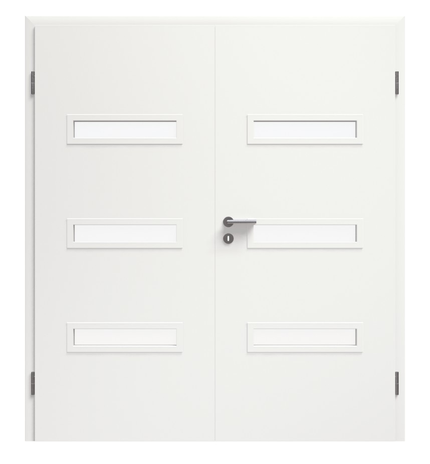 Gładkie skrzydła drzwi wyglądają czysto i świeżo. Powierzchnia jest wielokrotnie malowana w klasycznym białym odcieniu RAL 9016. Dzięki temu otrzymują Państwo wysokiej jakości powierzchnię, którą można zobaczyć i poczuć. Trzy wąskie przeszklenia na każdym skrzydle definiują wygląd modelu. Poziome przeszklenia wyglądają szczególnie nowocześnie. Dla współczesnego designu zaleca się wykonanie listew szklanych w wersji na równo z powierzchnią. Różne rodzaje szkła mogą być opcjonalnie dodane.